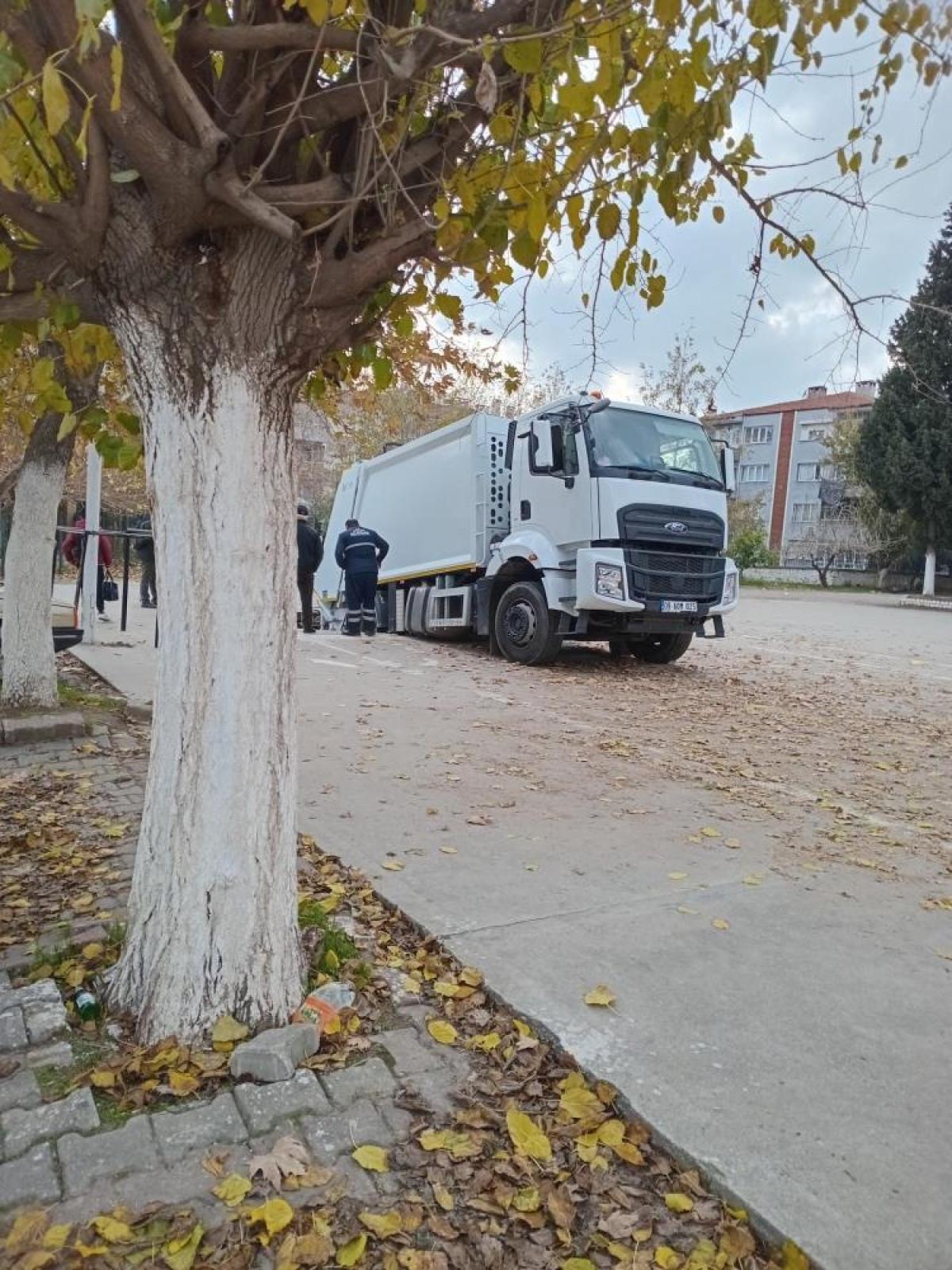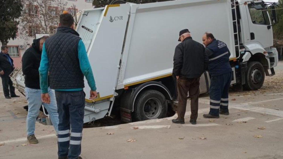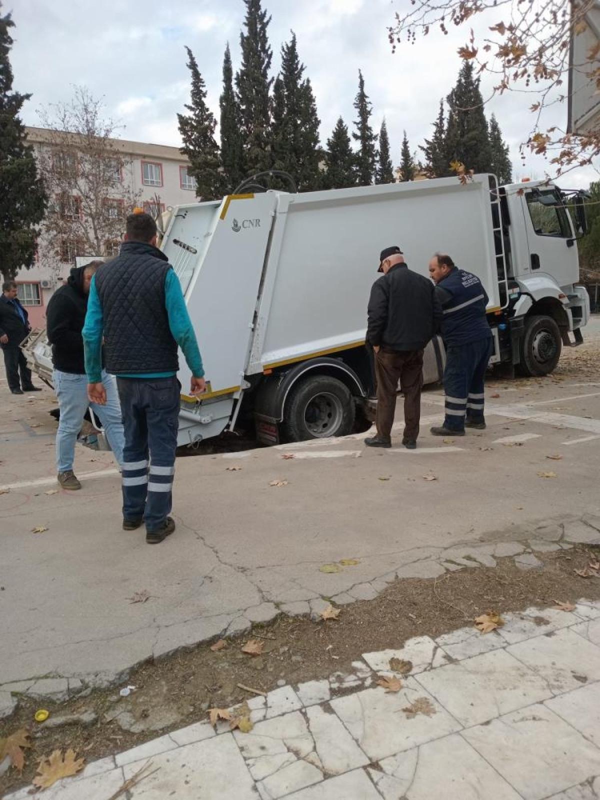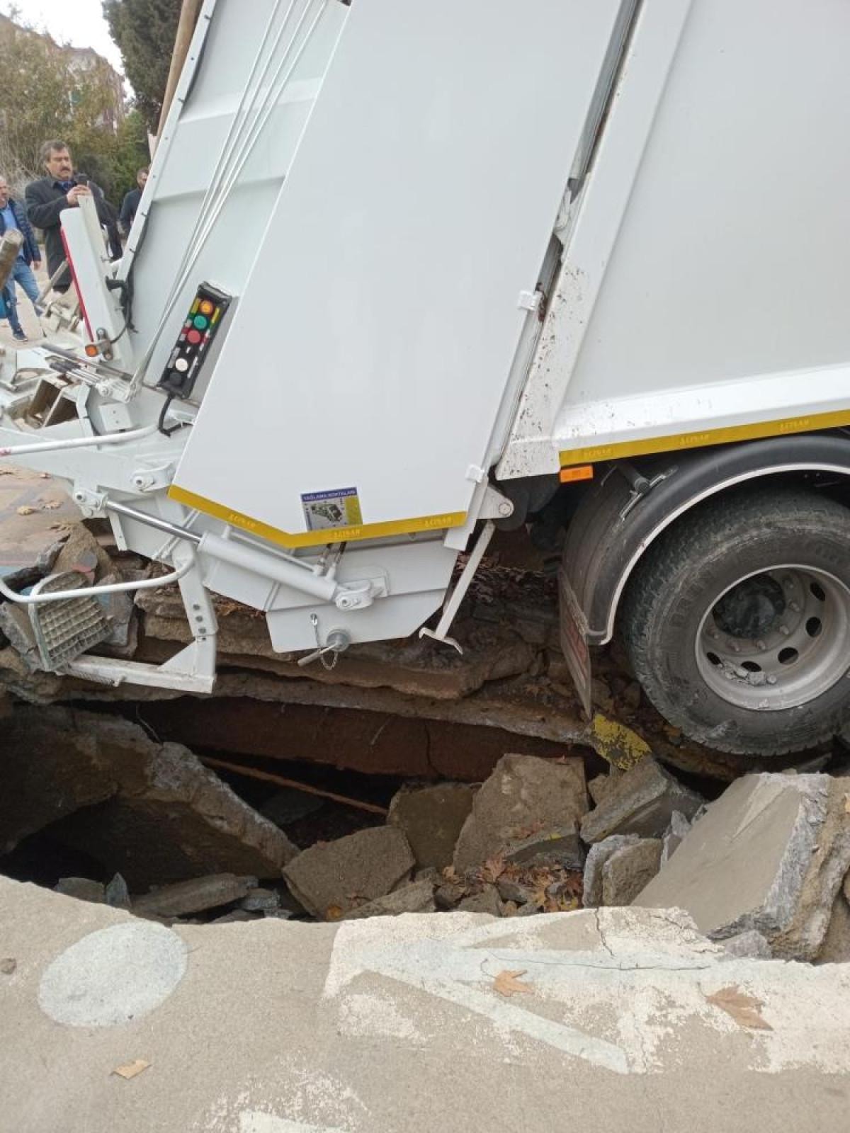 Oluşan çökme nedeniyle belediyenin çöp kamyonu oluşan çukura düştü.