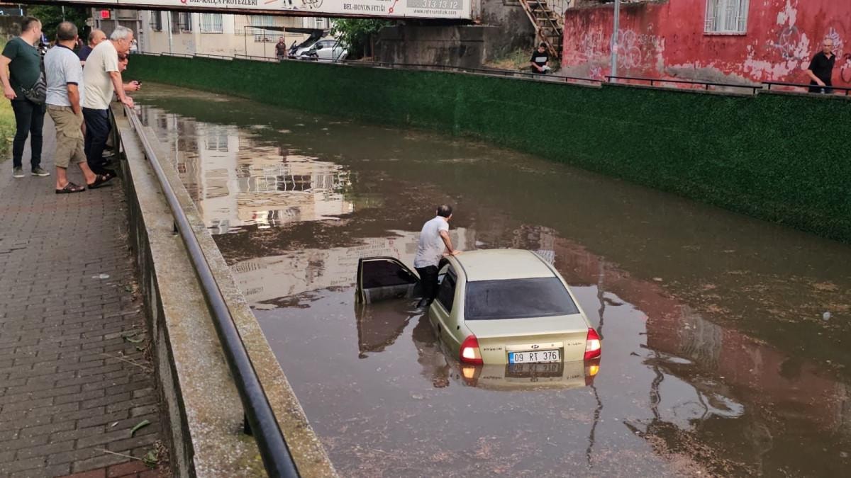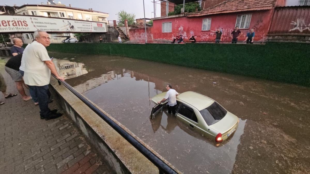 Diğer tarafta ise uyarı bariyeri konuldu. Uyarı bariyerini fark etmeyen bir sürücü, hızla girdiği alt geçitte otomobili ile sulara gömüldü.