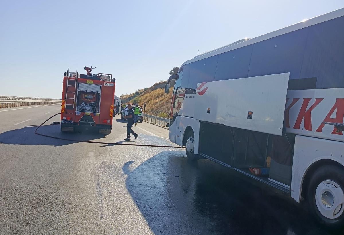 Otobüsten alevlerin yükseldiğini fark eden sürücü, aracı sağa çekerek yolcuları tahliye etti.