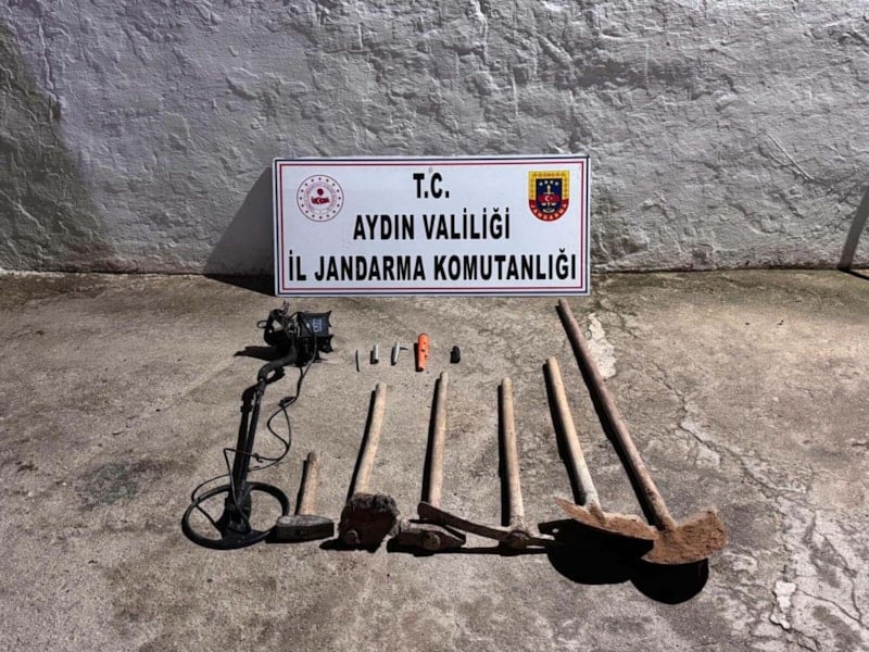 Şüphelilerin kaçak kazıda kullandıkları belirlenen 2 dedektör, 3 parça metal çubuk, 1 gece görüşlü pointer, 1 el feneri ve 13 muhtelif kazı malzemesi ele geçirildi.