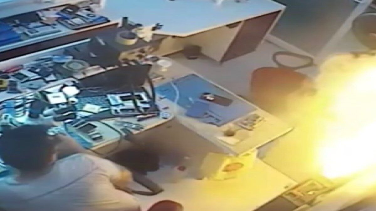 Tamir edilmek için sırasını bekleyen cep telefonuna takılı olan batarya iş yeri sahibi Ömer Çağlar Sürer'in telefon tamiri yaptığı sırada bir anda alev alarak patladı.