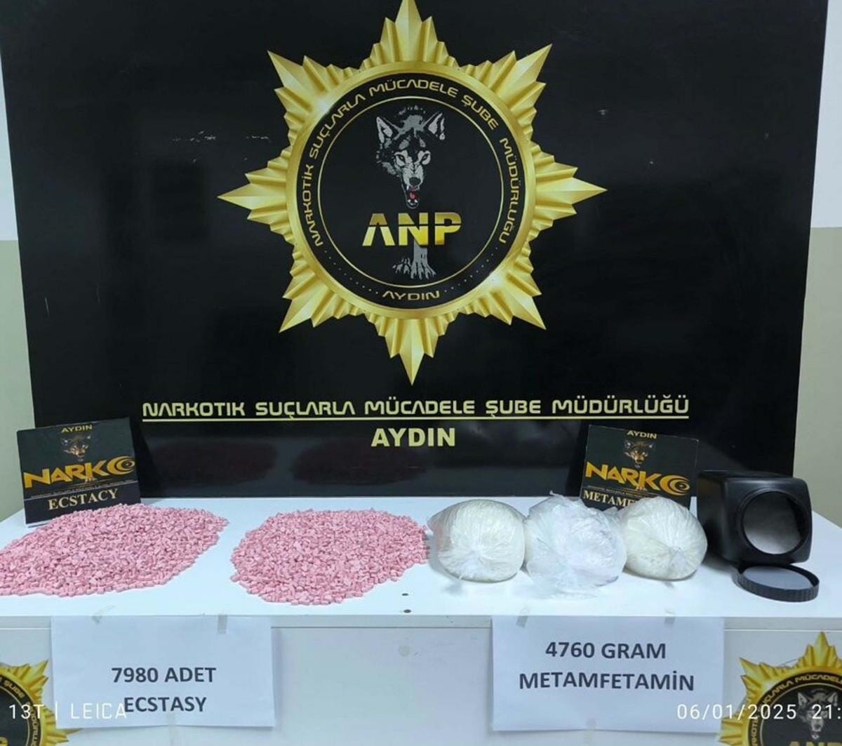 Belirlenen adrese operasyon yapan ekipler, evde 5 parça 4 kilogram 760 gram metamfetamin ve 2 parça 7 bin 980 ecstasy uyuşturucu hap ele geçirildi.