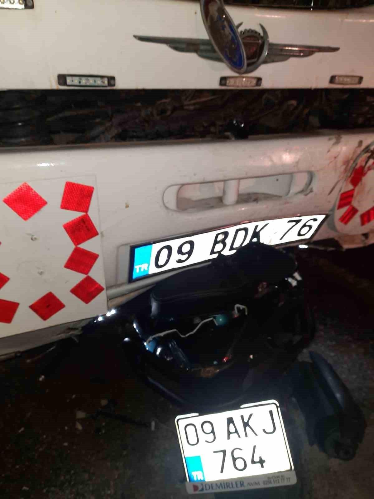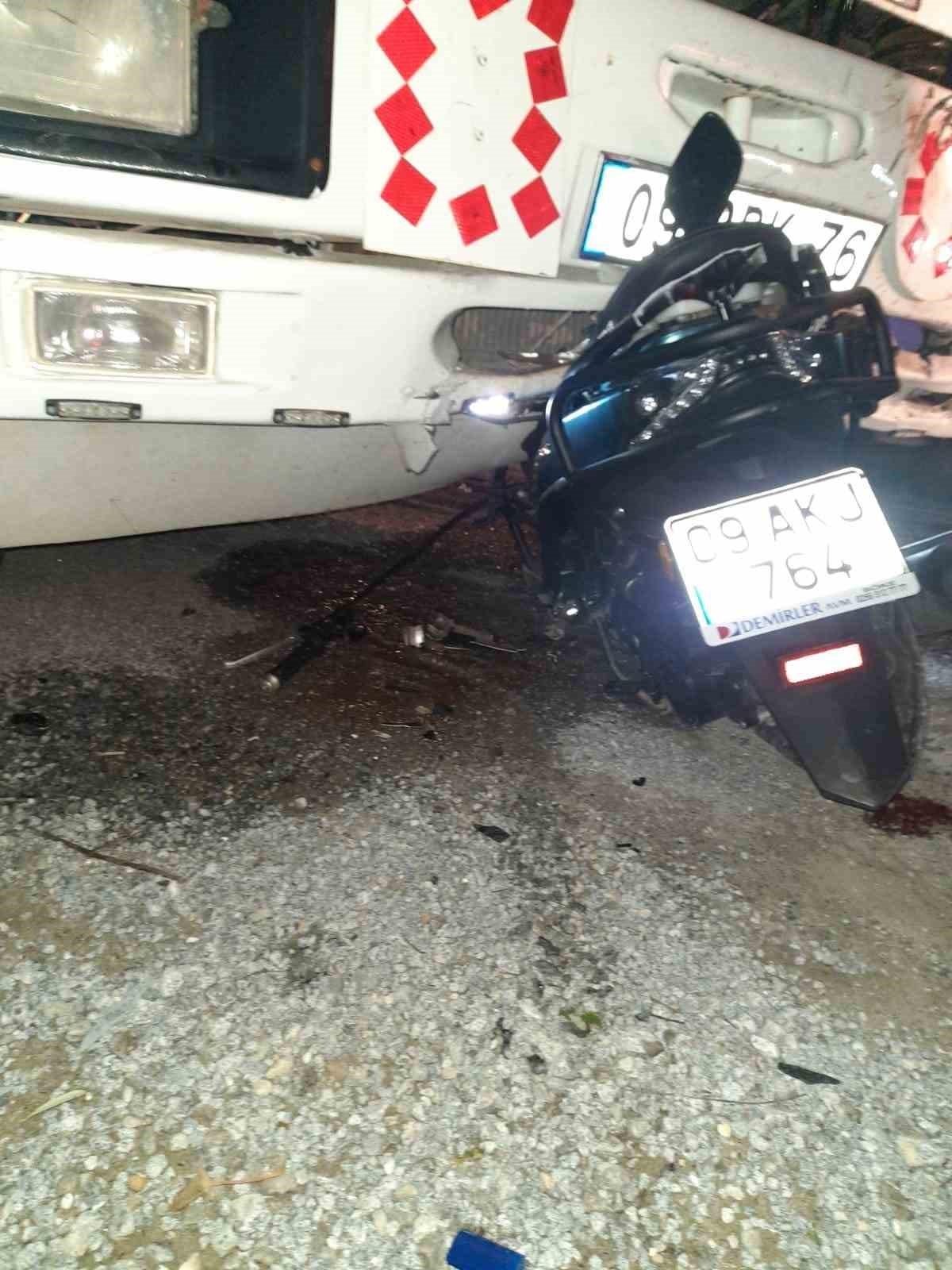 Kuşadası'nda meydana gelen olayda, Ç.D yönetimindeki 09 AKJ 764 plakalı motosiklet, virajı alamayınca karşı yönden gelen 09 BDK 76 plakalı kamyonetle çarpıştı.