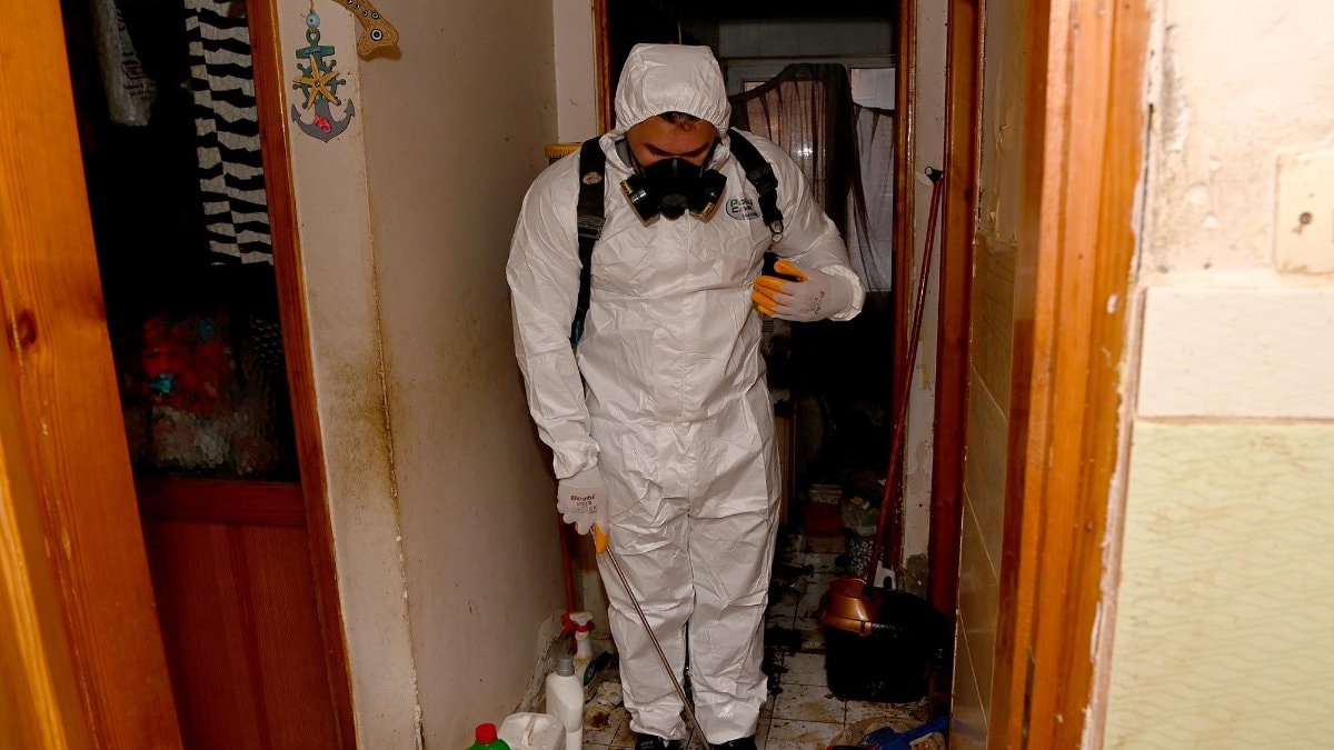Sıcak suyla yıkanıp temizlenen ev, ilaçlanırken apartman sakinleri Kuşadası Belediyesi ekiplerine teşekkür etti.