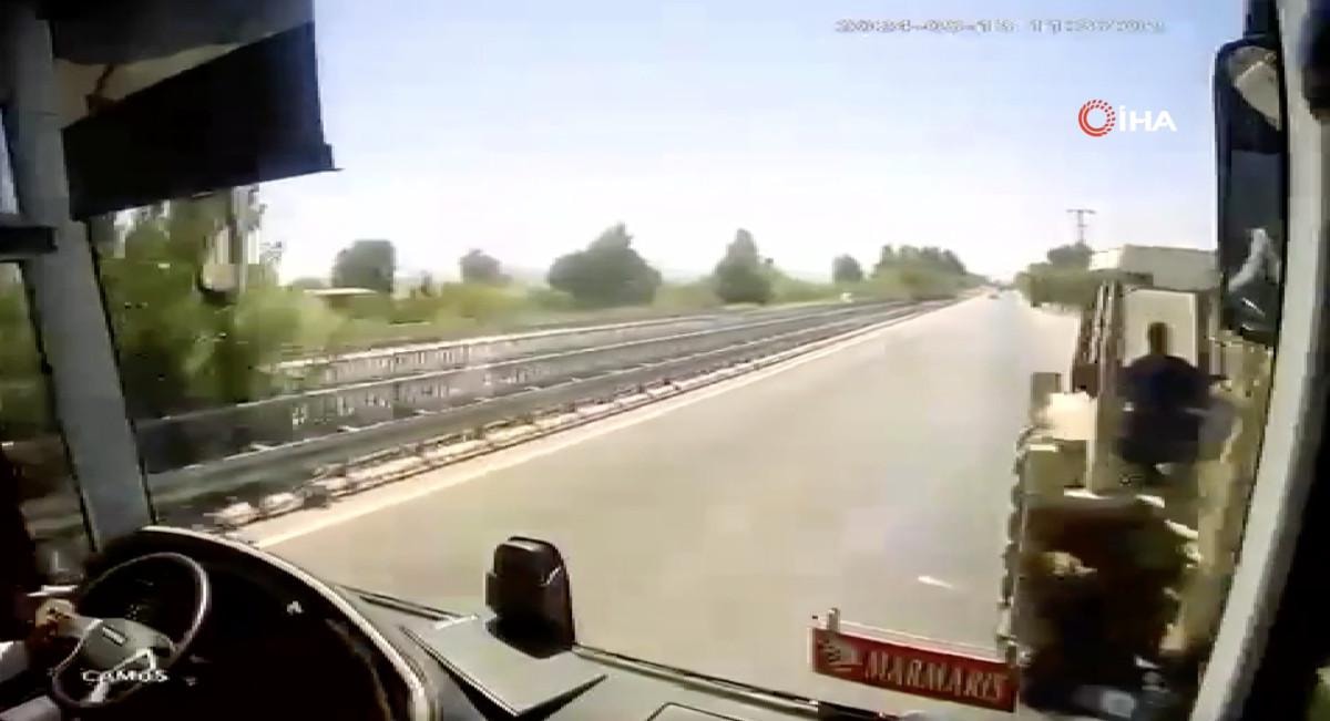 Görüntülerde, aynı yönde seyreden otobüsün bir anda iş makinesine çarpması yer aldı. Kazayla ilgili soruşturma sürüyor.