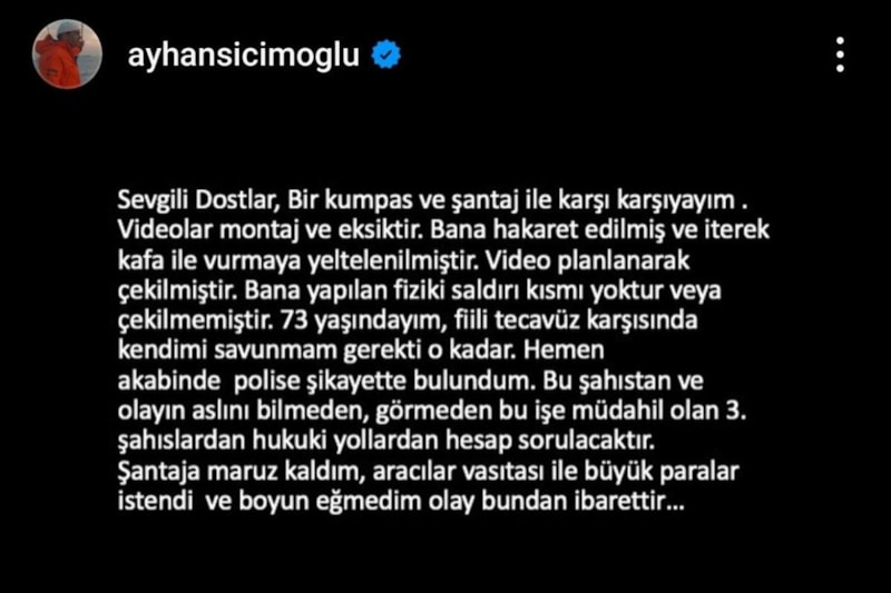 "Sevgili Dostlar, bir kumpas ve şantaj ile karşı karşıyayım. Videolar montaj ve eksiktir. Bana hakaret edilmiş ve iterek kafa ile vurmaya yeltelenilmiştir. Video planlanarak çekilmiştir. Bana yapılan fiziki saldırı kısmı yoktur veya çekilmemiştir. 73 yaşındayım, fiili tecavüz karşısında kendimi savunmam gerekti o kadar. Hemen akabinde polise şikayette bulundum. Bu şahıstan ve olayın aslını bilmeden, görmeden bu işe müdahil olan 3. şahıslardan hukuki yollardan hesap sorulacaktır. Şantaja maruz kaldım, aracılar vasıtası ile büyük paralar istendi ve boyun eğmedim olay bundan ibarettir…"