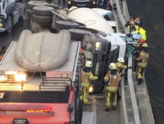 İstanbul Bağcılar TEM bağlantı yoluna girmeye çalışan beton mikseri, virajı alamayarak devrildi.