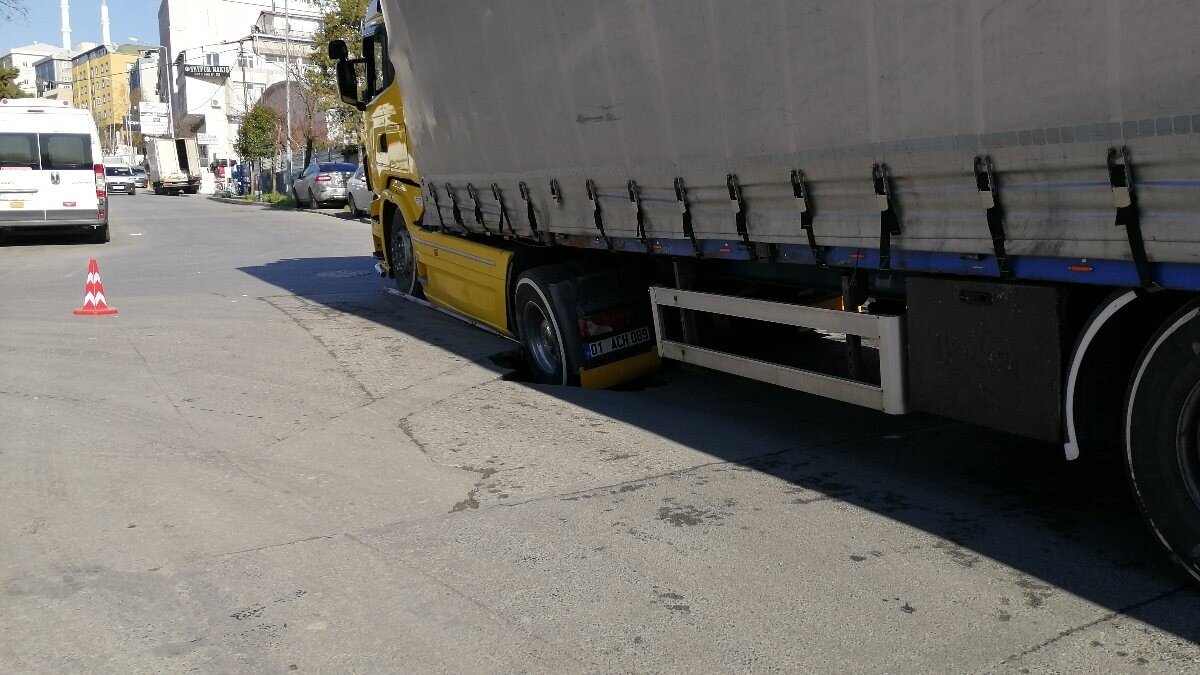Adana'dan İstanbul'a 14 ton ipliğin getirildiği 01 ACH 089 plakalı tır, sokaktan geçtiği sırada çöken yola saplandı.