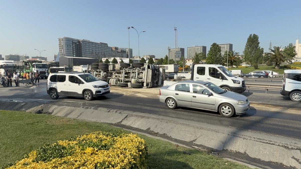 İstanbul'un Bahçelievler ilçesinde Basın Ekspres Mahmutbey istikameti yan yolunda Ramazan Begik idaresindeki beton mikseri, virajı alamayınca kontrolden çıkarak yan yola devrildi.