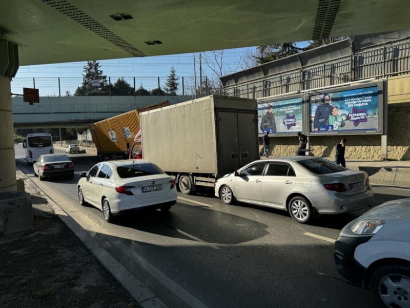 Bakırköy’de yüksekliği hesaplayamayarak alt geçide çarpan tırın dorsesi yan dönerken, arkadan gelen kamyonet sürücüsü ani fren yapınca otomobil de kamyonete çarptı. Kazada üç araçta hasar meydana geldi.