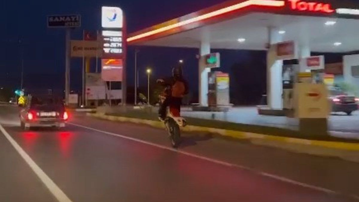 Motosiklet sürücüsünün tek teker üzerindeki hareketleri trafikte tehlike saçtı.