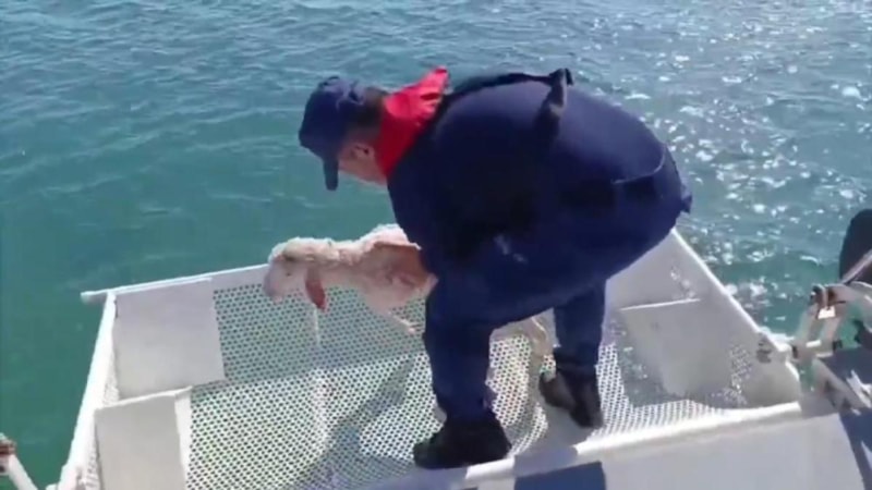 Balıkesir’in Ayvalık ilçesinde, Sahil Güvenlik Kuzey Ege Grup Komutanlığı ekipleri, Alibey (Cunda) Adası açıklarında devriye gezerken deniz yüzeyinde sürüklenen bir kuzu fark etti. Hızla harekete geçen ekipler, tekneyle kuzuyu güvenli bir şekilde denizden çıkardı.