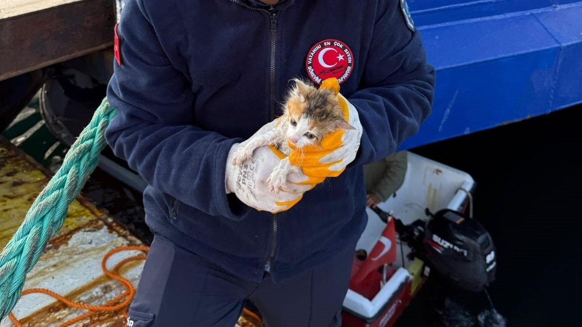 Yavru kedinin denize düştüğü ihbarı üzerine karadan ulaşamayan ekipler, sandalla denize açılarak kurtarma çalışmalarına başladı.