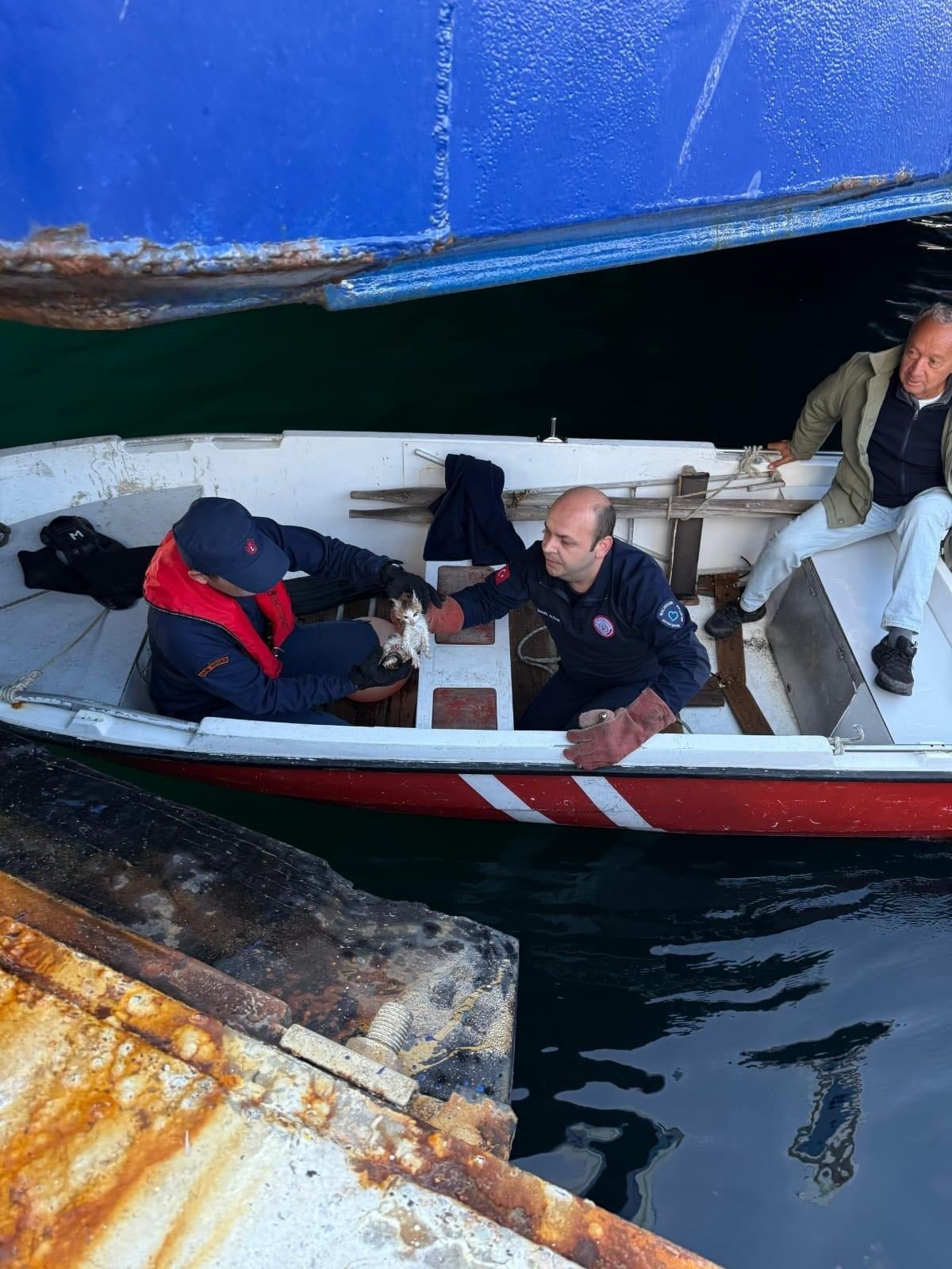 - Denizdeki paletin üzerine tutunan yavru kedi, sandalla yanına ulaşan ekipler tarafından kementle karaya çıkarıldı.