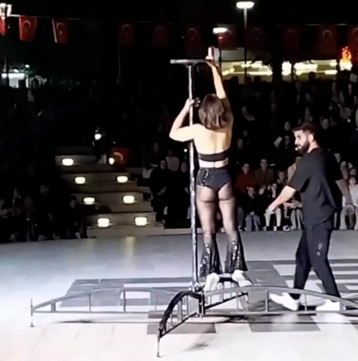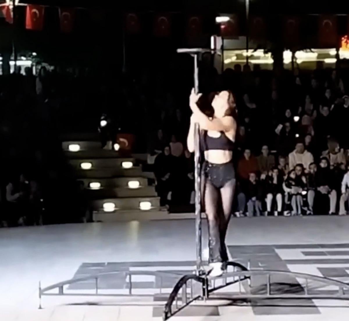 Veli ve küçük çocukların bulunduğu parkta, gösteri için getirilen bir kadın dansçı, direk dansı yaptı.