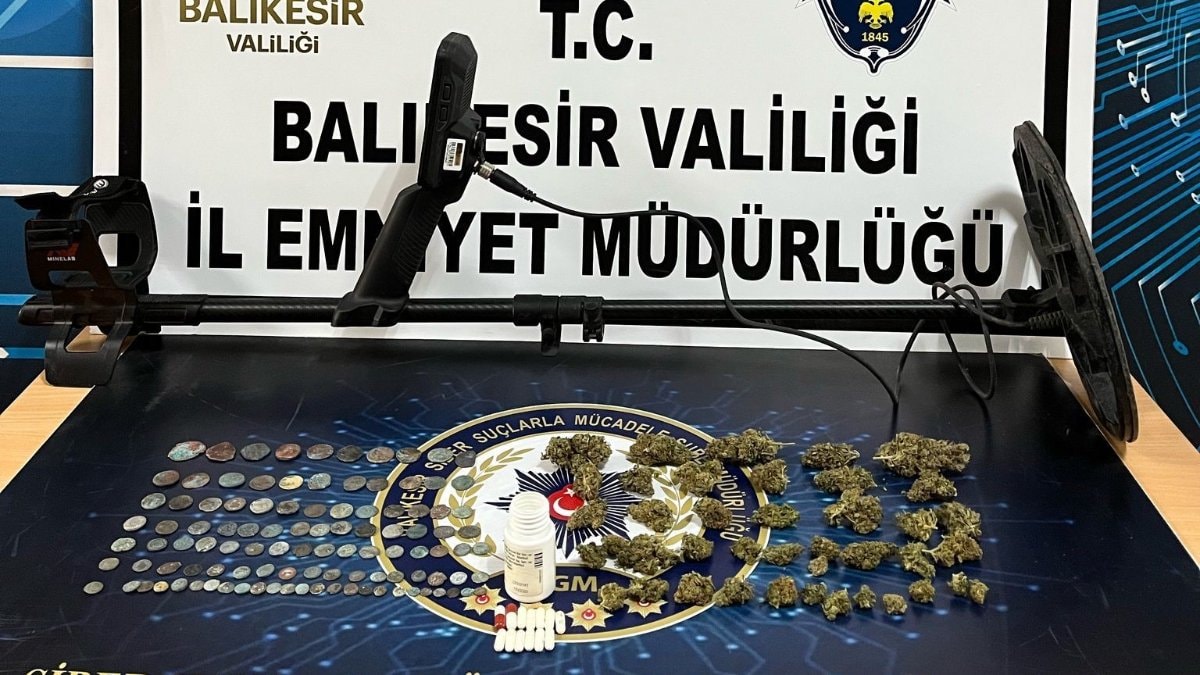Soruşturma kapsamında Balıkesir ve İstanbul’da 4 adreste yapılan aramalarda; 3 bilgisayar, bir laptop, 10 cep telefonu, bir hafıza kartı, 6 simkart, bir harddisk, 47 skunk, 13 sentetik ecza maddesi, bir adet maden tarama dedektörü, 306 tarihi eser madeni para ele geçirildi.