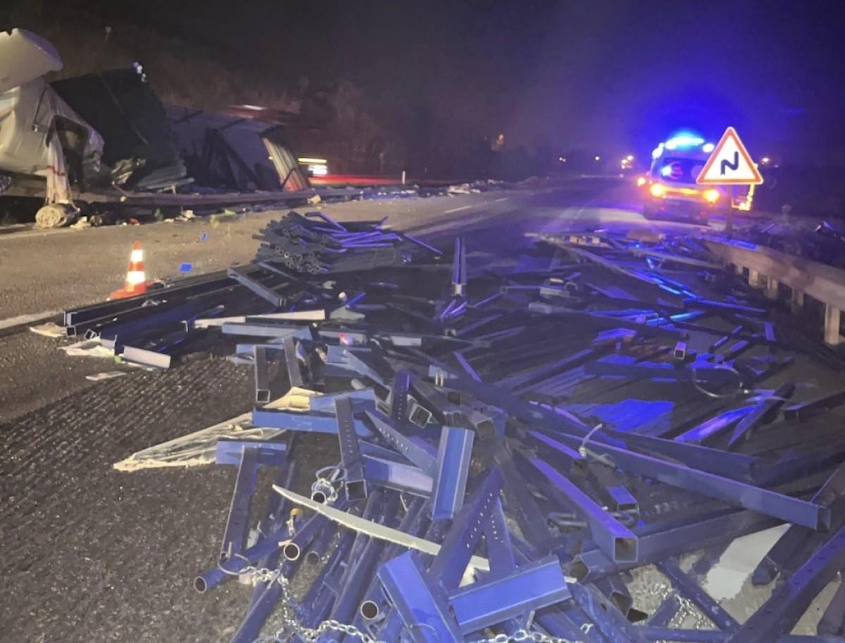 Tırın dorsesine ait 880 NH 89 plakalı kısmında yer aldığı araçtan yola savrulan yükler kara yoluna saçıldı.