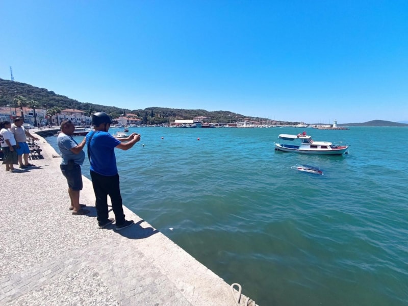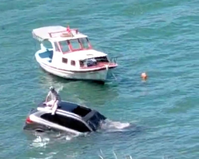Ayvalık ilçesinde sahil yolunda denize uçan otomobilin sürücüsü, kendi imkanlarıyla içinden çıktığı aracının üzerine oturup yardım beklerken o anlar cep telefonuyla görüntülendi.