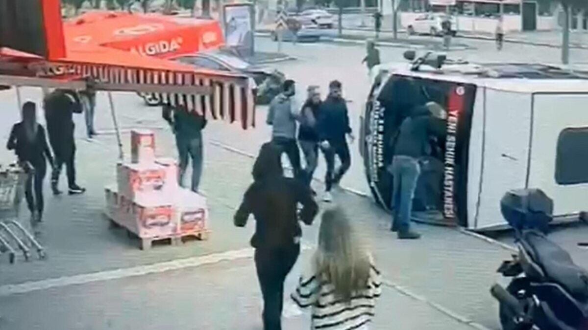 Yandan çarpılan minibüs, çarpmanın şiddetiyle kontrolden çıkarak devrildi.