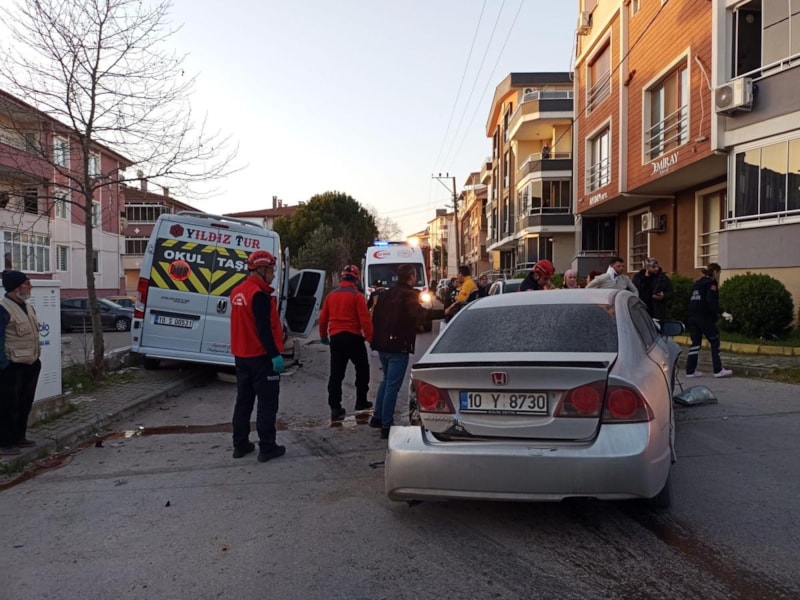 Balıkesir'in Karesi ilçesine bağlı Akçay Sokak üzerinde seyreden işçi servisi sürücüsü, karşı yönden gelen E.Ç. idaresindeki otomobil ile kafa kafaya çarpıştı.