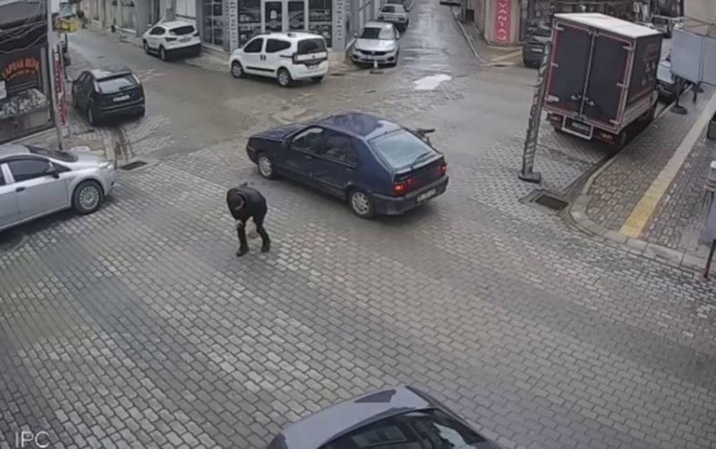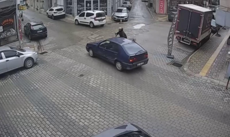 Çarpmanın etkisiyle kaskı kafasından fırlayan motosiklet sürücüsü, önce aracın üstüne ardından yere düştü. Ayağa kalkan motosiklet sürücüsü kendini kontrol ederken, kaza anı güvenlik kamerasına yansıdı.