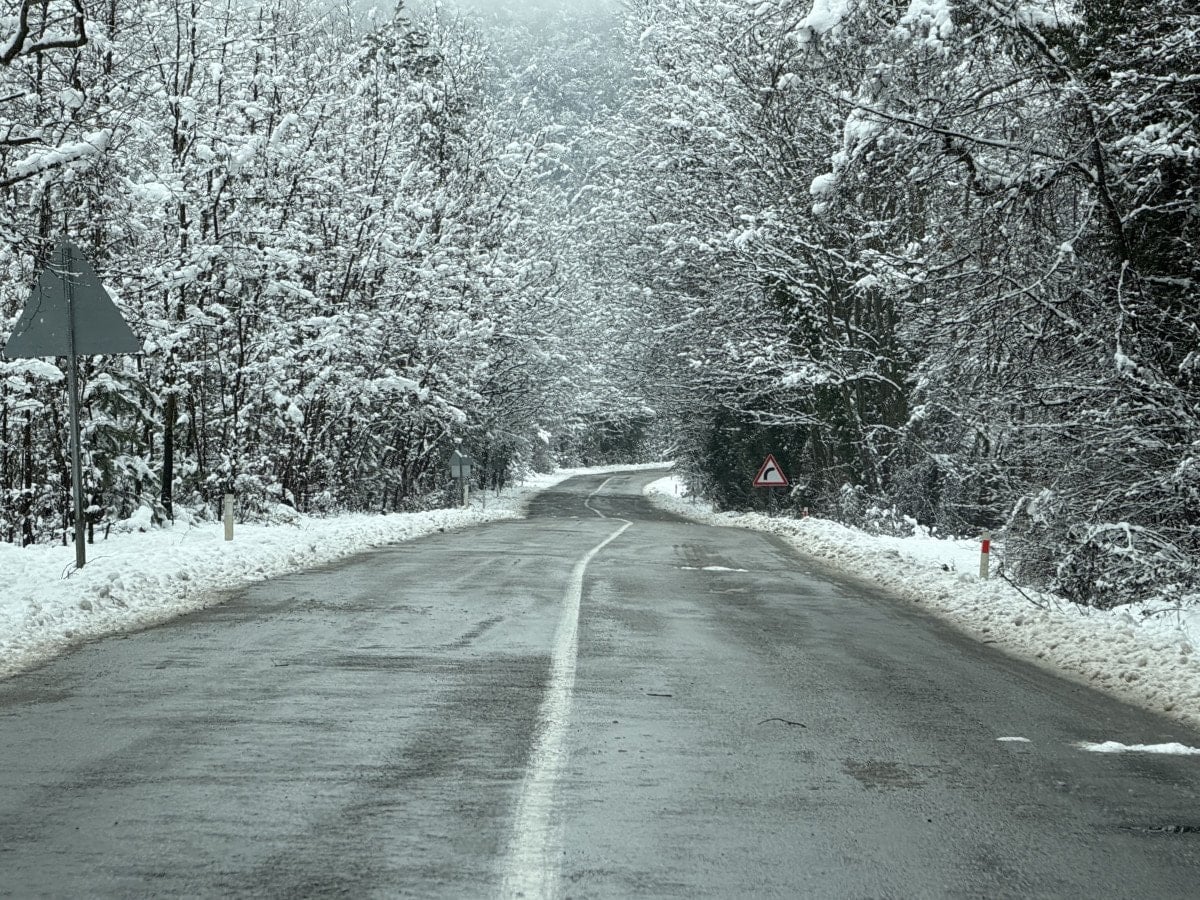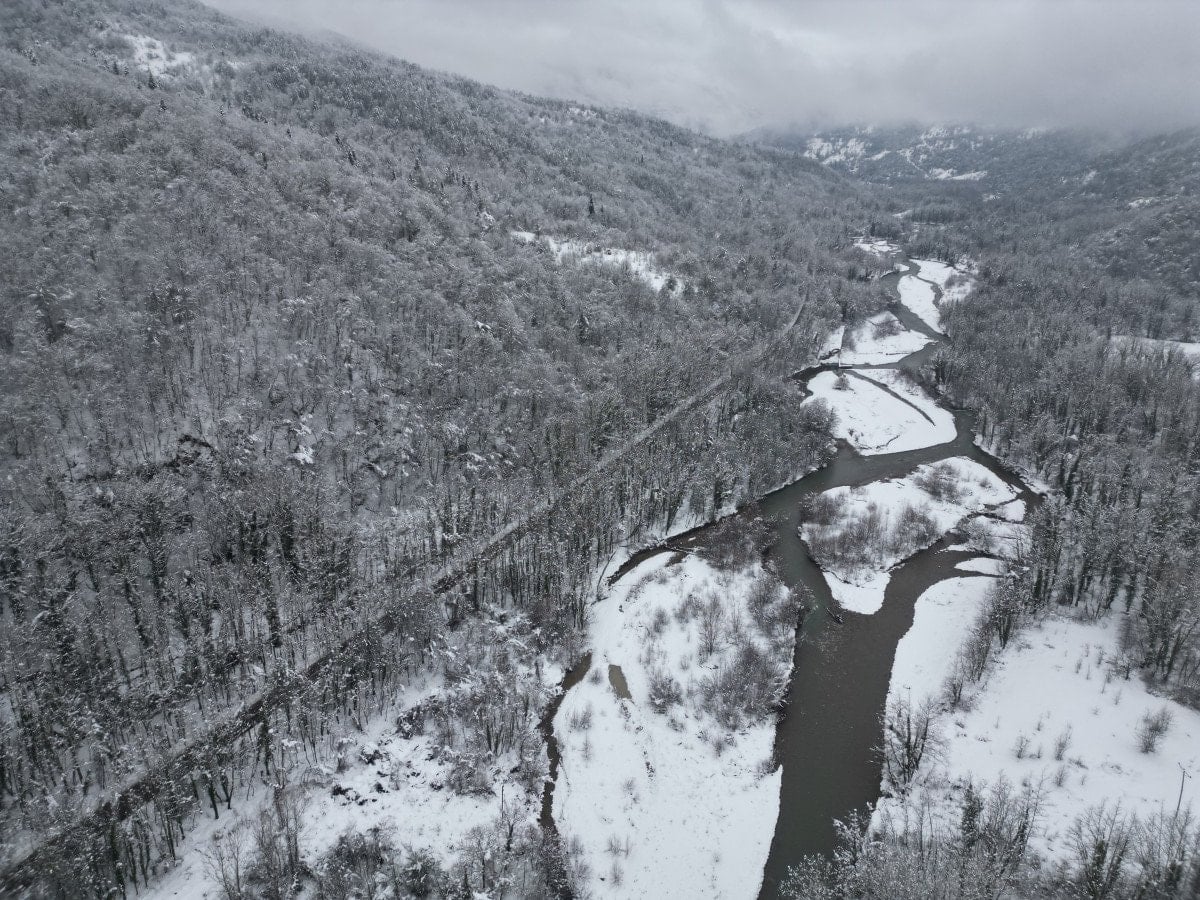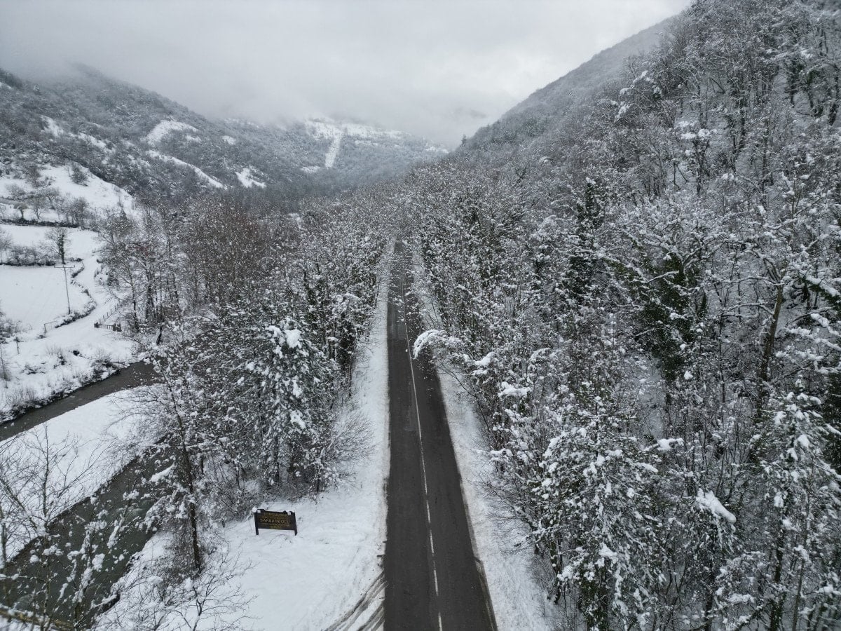 Sürücüler, karla kaplı ağaçların arasında keyifle yolculuk yaptı. Yolun karla kaplı eşsiz manzarası, drone ile görüntülendi.