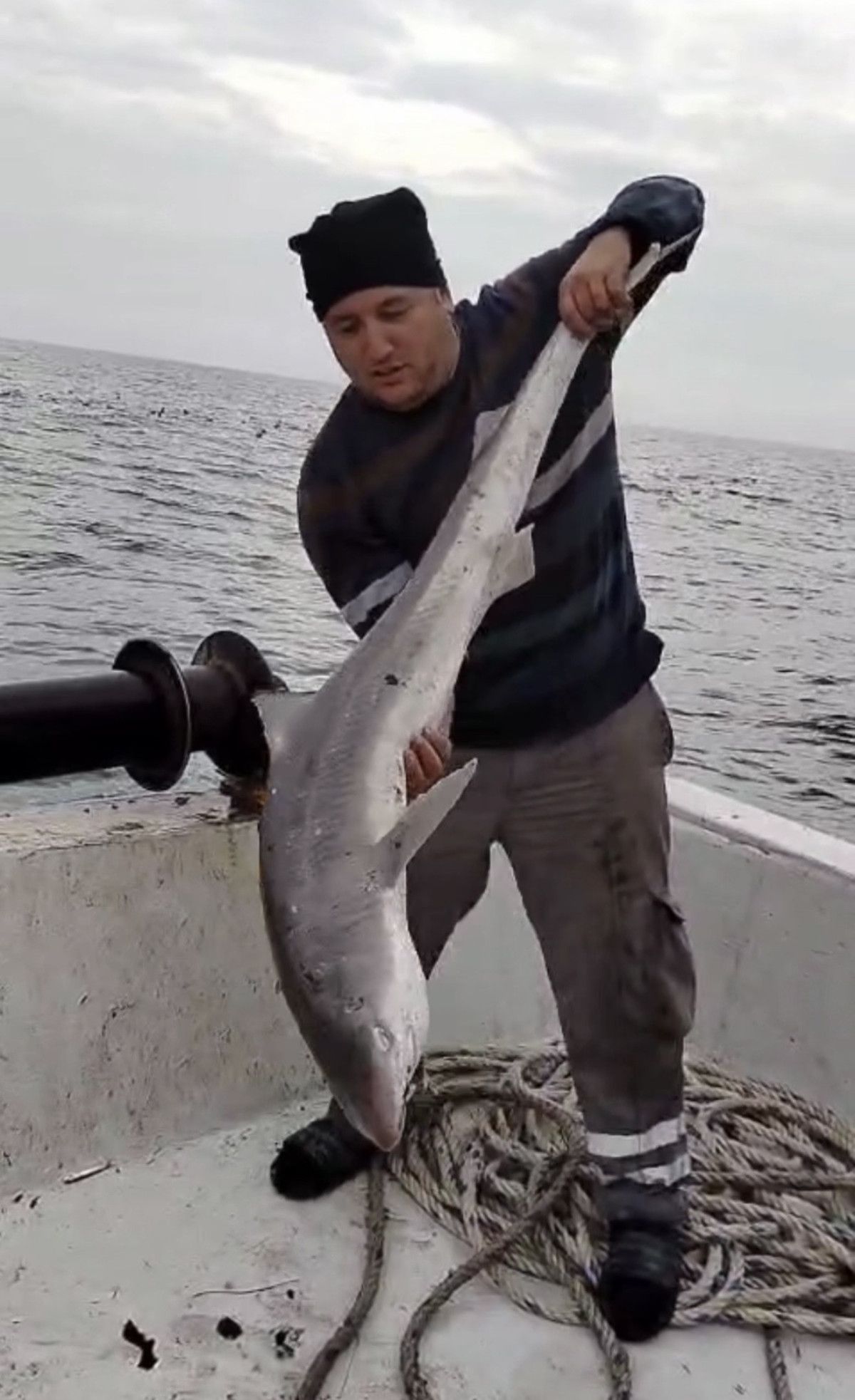 Tekne sahibi Tayfun Uça, güçlükle tuttuğu köpek balığını tekneye çıkarttı.