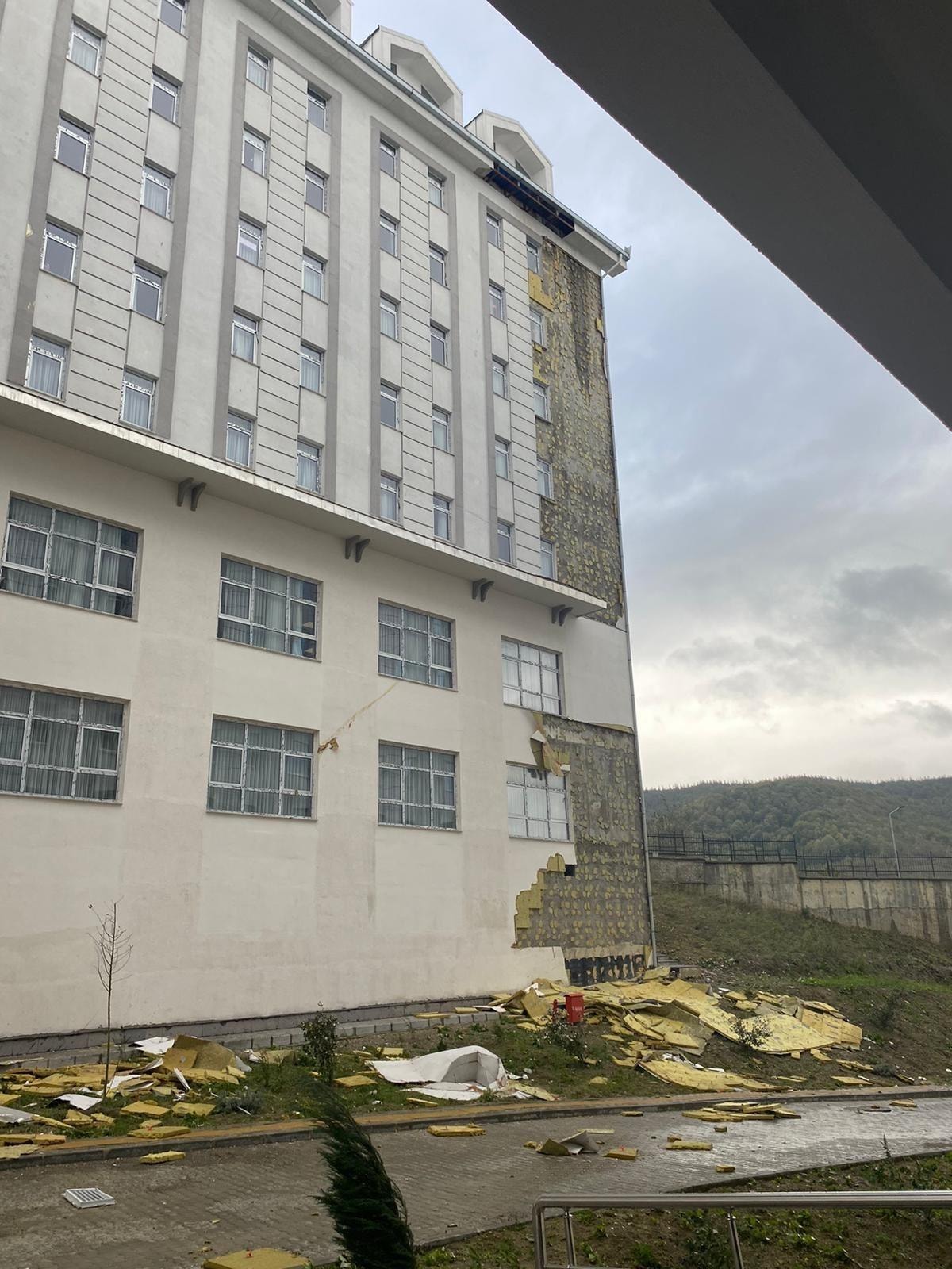 Yurt binasının dış cephesinde bulunan yalıtım malzemeleri fırtınada yerinden çıkarken, yalıtım malzemesinin duvardan ayrılıp, savrulduğu anlar cep telefonu kamerası ile kaydedildi.