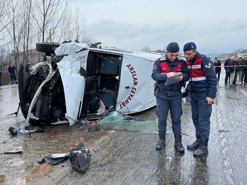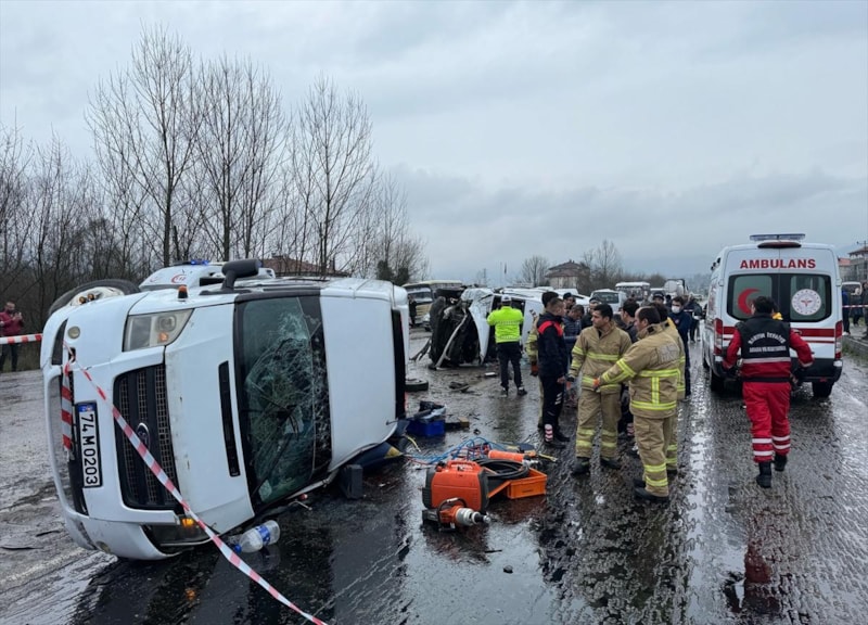 Aynı yöne giderken çarpışan iki minibüs devrilirken kazanın ardından olay yerine çok sayıda sağlık, polis ve itfaiye ekibi sevk edildi.