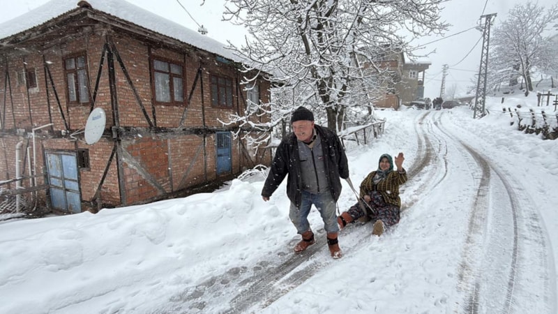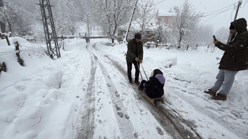 Köydeki kar yağışı nedeniyle eşinin çektiği kızakla kayan Hanife Kızılyar, "Biz 2-3 senedir kar görmedik. Biz bu anları bekliyorduk. Kar kalınlığı 50-60 santimi geçti. Biz de köyde kızak kayıyoruz, eşim kızağı çekiyor. Biz de böyle eğleniyoruz." ifadelerini kullandı.