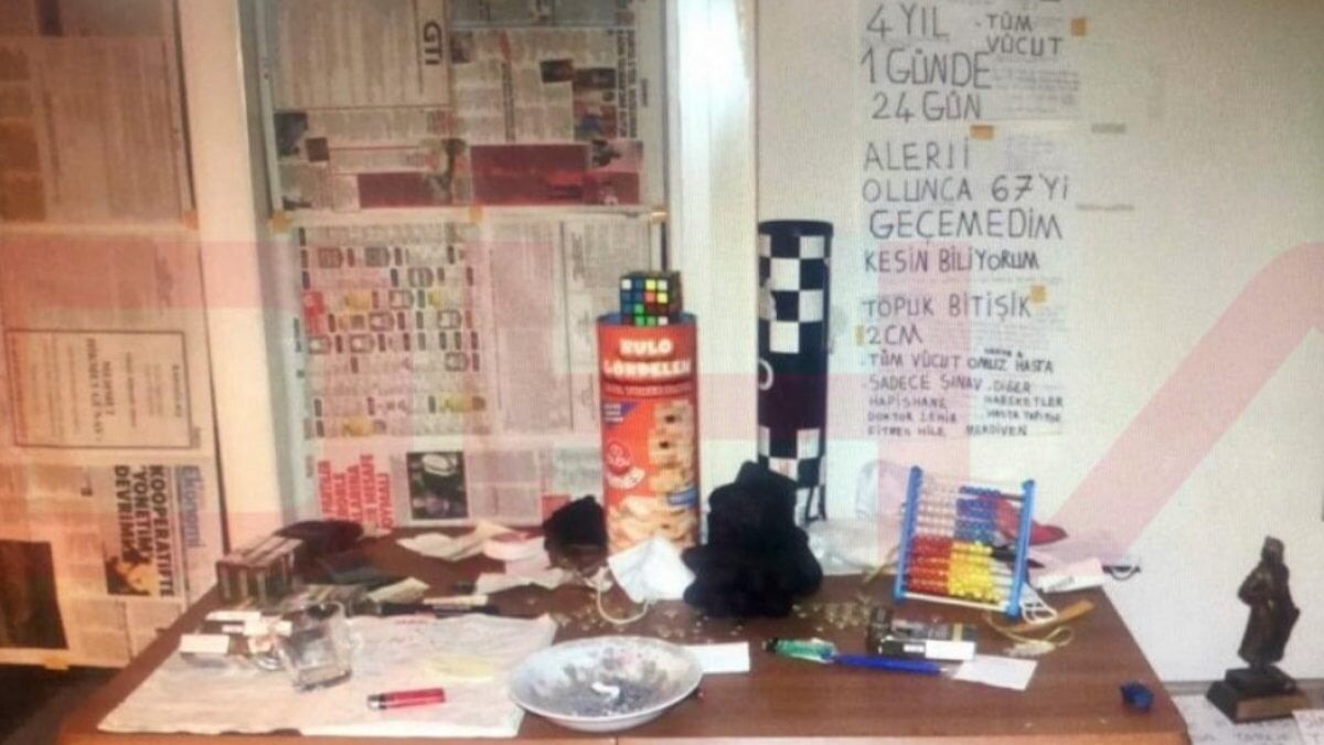 Öte yandan odada bulunan masanın üzerinde ise çok sayıda bozuk para, sigara kutusu, satranç, jenga oyunu, rubik küp ve abaküs olması dikkat çekiyor.