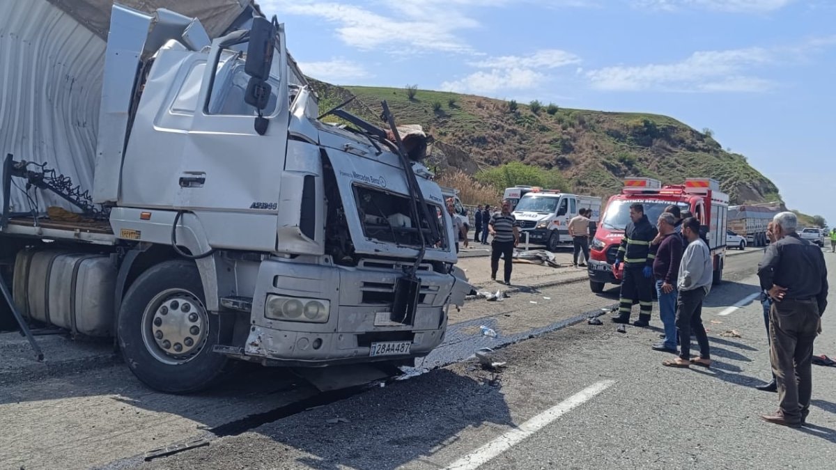 Yol çalışması nedeniyle tek şeride düşen yolda tuğla yüklü 02 AJ 577 plakalı tır ile karşıdan yönden gelen 28 AA 487 plakalı tır, kafa kafaya çarpıştı.