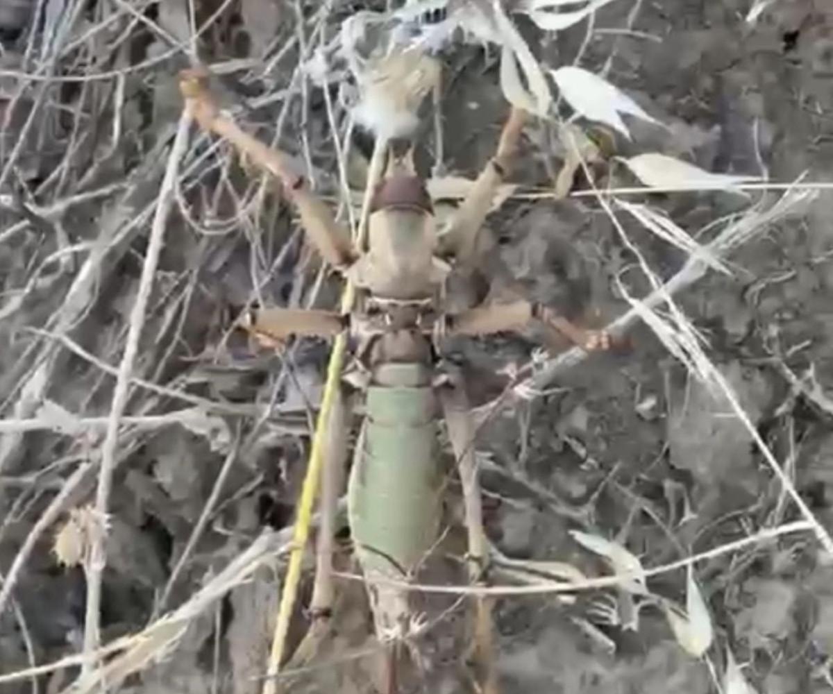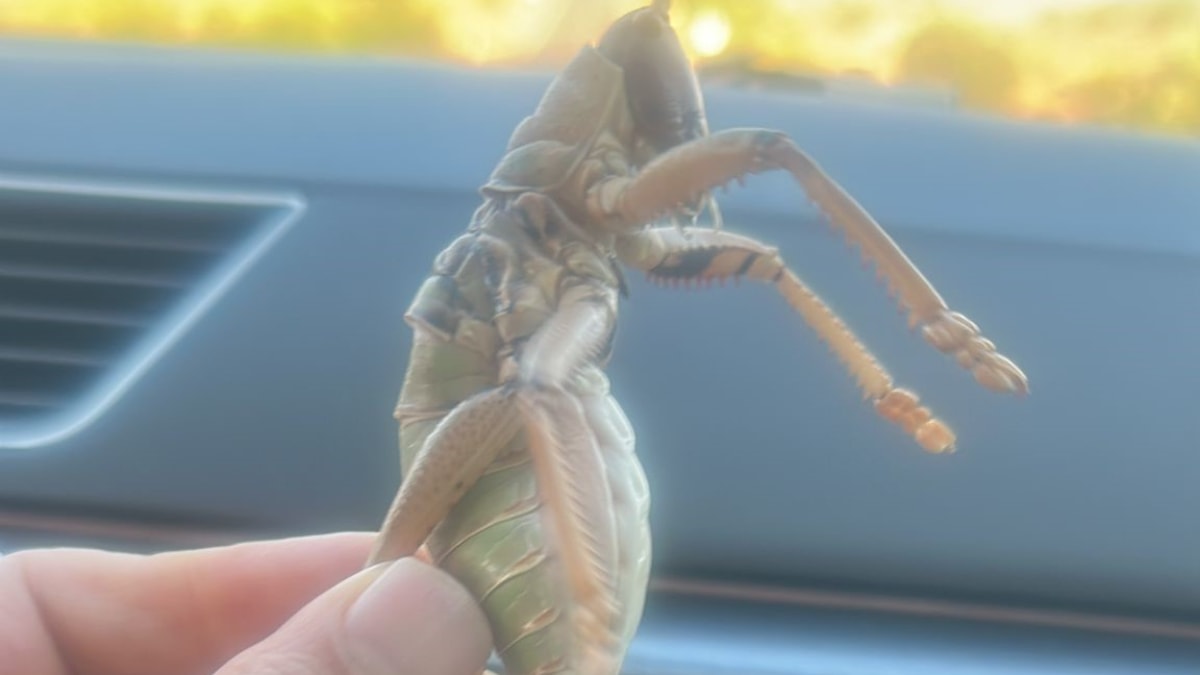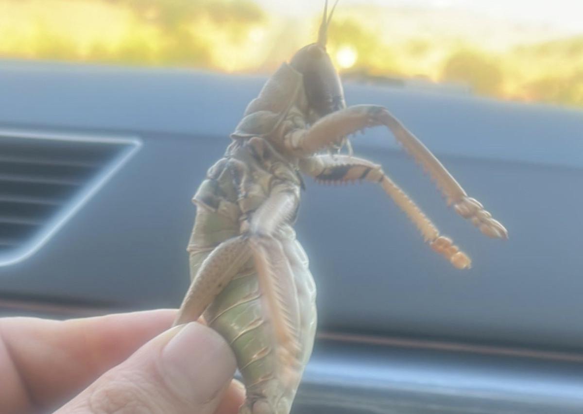 Kırsalda piknik yapan vatandaşlar, büyüklüğü 20 santimetreyi bulan dev bir etçil çekirgeyle karşılaştı.