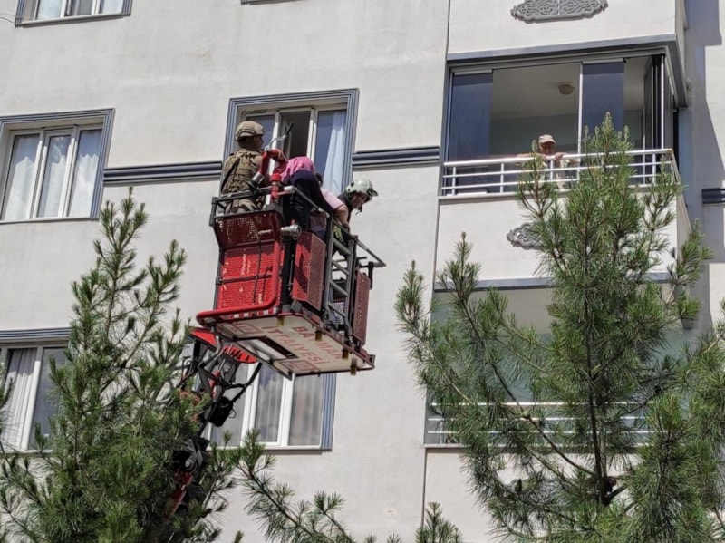 Yaklaşık 4 saat içeride mahsur kalan anne, baba ve kızları, jandarma eşliğinde itfaiye ekipleri tarafından evden itfaiyenin sepetli aracıyla aşağı indirildi.