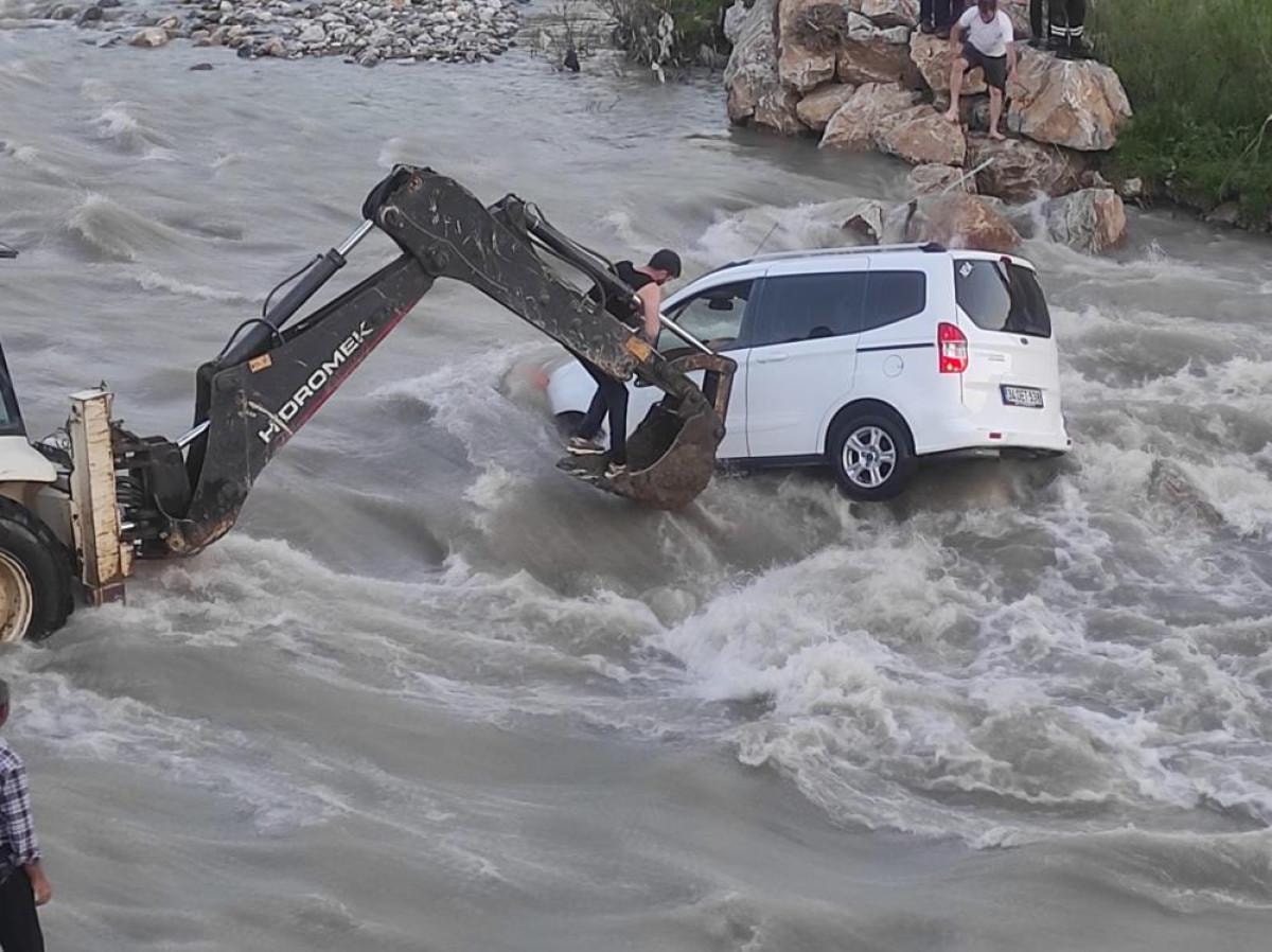 Vatandaşların araçtan çıkarılmasının ardından araç, olay yerine gelen iş makinesi ile sudan çıkararak sahiplerine teslim edildi.