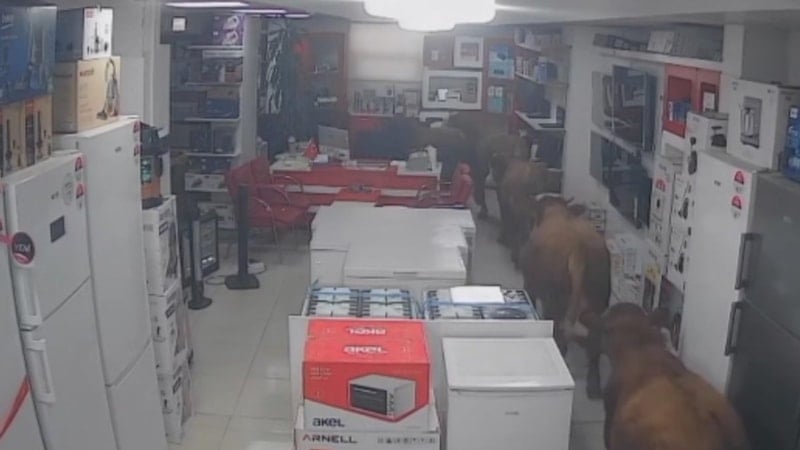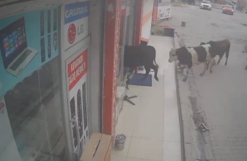 İş yerinin güvenlik kameralarına yansıyan görüntülerde, art arda koşarak mağazaya giren inekler ve esnafın hayvanları dışarı çıkarmaya çalıştığı anlar yer aldı. Bu sırada bazı eşyaların devrildiği, ineklerin ise bir süre sonra iş yerinden çıkarak uzaklaştığı görüldü.