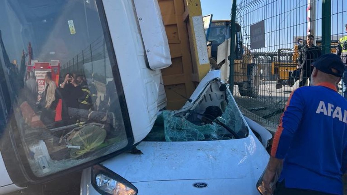 İsmi öğrenilemeyen hafriyat kamyonu, sürücüsünün sağ dönüşü sırasında Mehmet Gümüş idaresindeki 27 AJD 628 plakalı hafif ticari aracın üzerine devrildi.