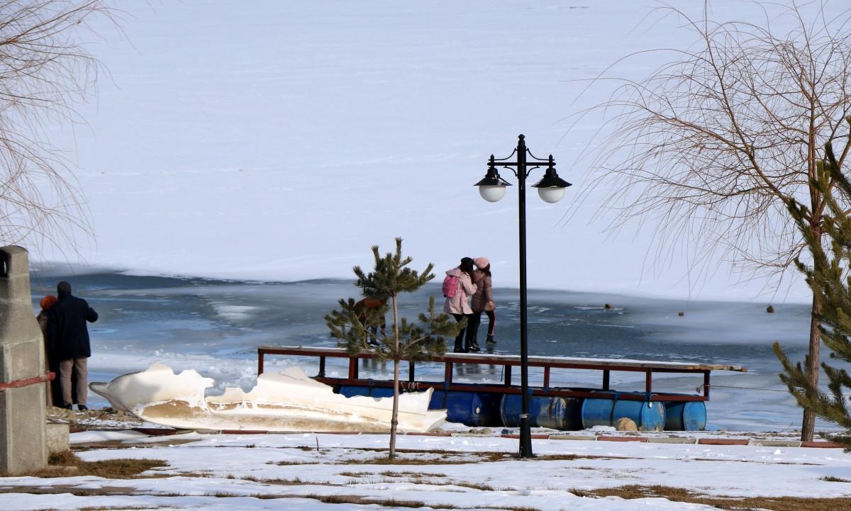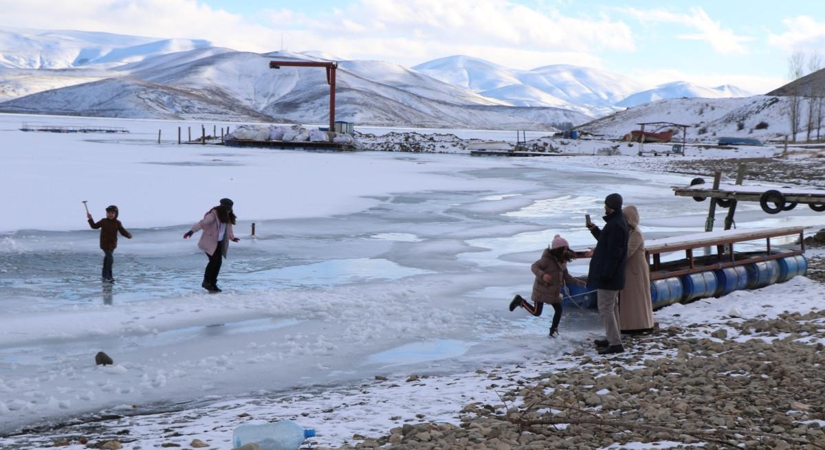 İki dağ arasında gökyüzündeki bulutların buza yansıdığı gölün manzarası kartpostallık görsel oluşturdu. Çocuklar buz tutan göl üzerinde yürüyüş yaparak eğlenceli anlar yaşadı.
