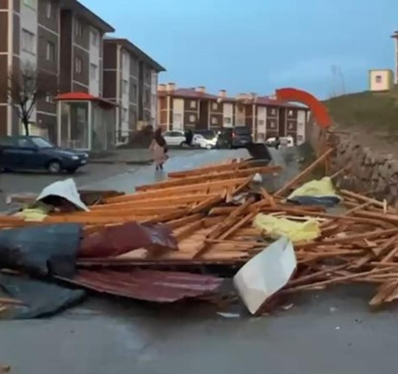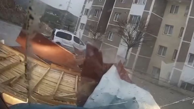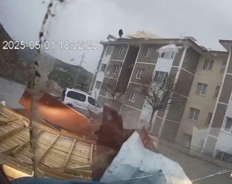Bayburt'ta etkili olan fırtına sırasında 4 katlı binanın çatısının bir bölümü uçup, yolcu indiren minibüse çarptı. Minbüsteki panik anları görüntülendi.