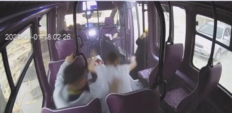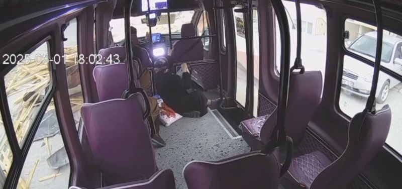 Çarpmanın etkisiyle minibüste kısa süreli panik yaşanırken, araç içi kameraya yansıyan anlar, o anları gözler önüne serdi.