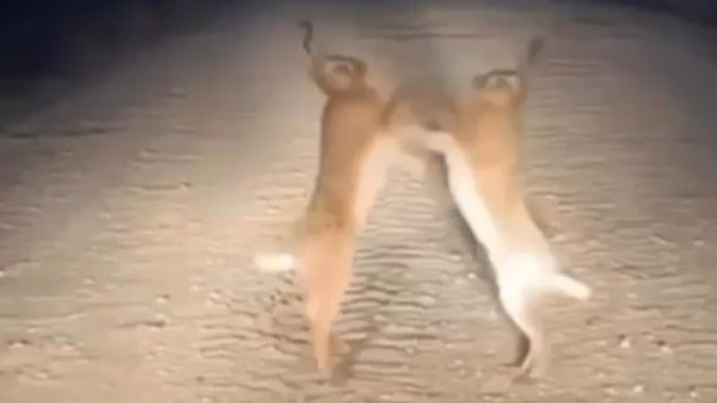 Arka ayaklarının üzerine kalkarak birbirlerine darbeler vuran tavşanların mücadelesi, adeta bir boks maçını andırırken, o anlar yoldan geçen bir sürücünün cep telefonu kamerasına yansıdı.