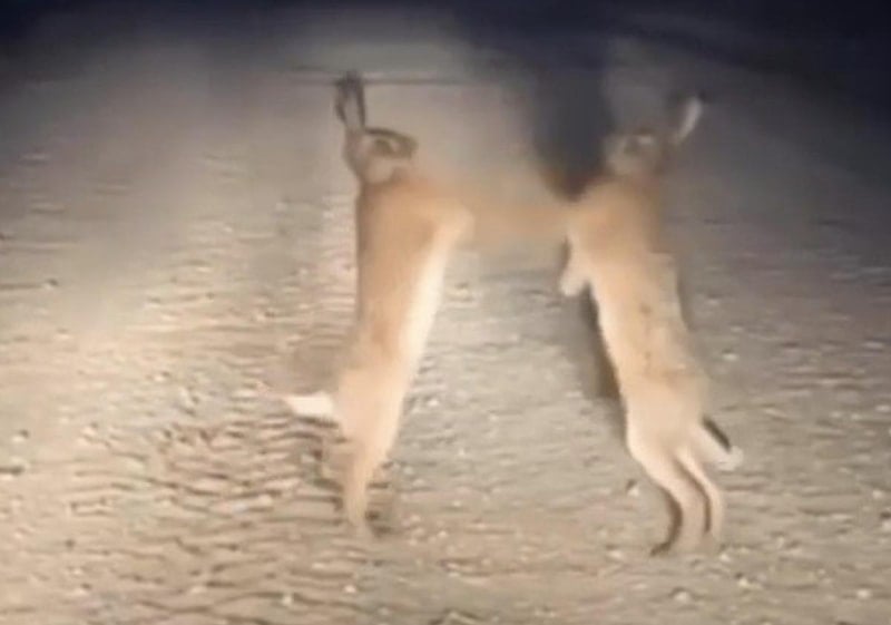 Görüntülerde, tavşanlardan birinin aldığı darbeler sonrası kaçtığı, diğerinin ise peşinden kovaladığı görülüyor.