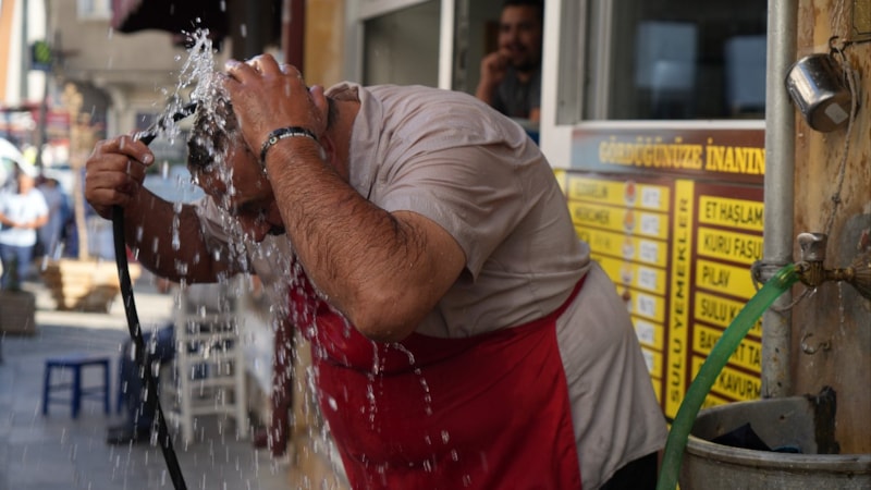Kent merkezinde kavurucu sıcaklardan bunalan lokanta esnafı Osman Demirhan ve çalışanı Haktan Bayram, serinlemek için bütün vücutlarını hortumla ıslatırken sıcak havada kıyafetlerinin yaklaşık 5 dakika içinde kuruduğunu söylediler.