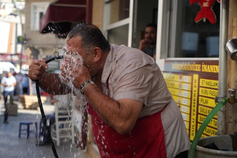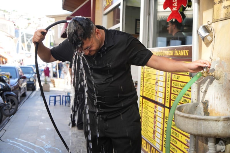 Kent merkezinde lokanta işletmeciliği yapan Osman Demirhan, ocak başında yüksek sıcaklık altında çalışmakta zorlanınca dükkânının önüne yaptırdıkları hayrat çeşmesine hortum bağlayıp, kendini yıkamaya başladı.