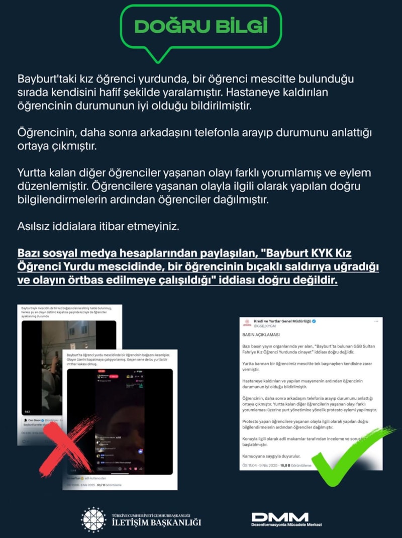Cumhurbaşkanlığı İletişim Başkanlığı Dezenformasyonla Mücadele Merkezi'nin sosyal medya hesabından yapılan açıklamada da Bayburt'taki kız öğrenci yurdunda bir öğrencinin mescitte bulunduğu sırada kendisini hafif şekilde yaraladığı, hastaneye kaldırılan öğrencinin durumunun iyi olduğu bildirildi.