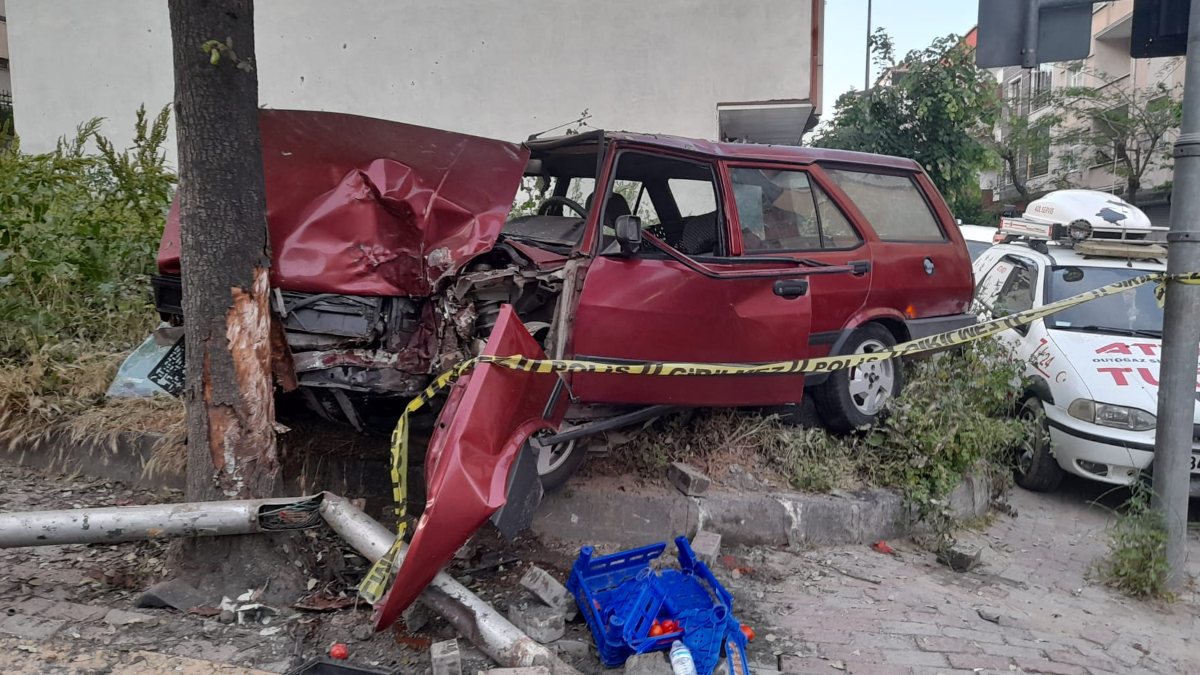 İstanbul Bayrampaşa’da domates taşıyan bir otomobil, sürücüsünün direksiyon hakimiyetini kaybetmesiyle önce trafik lambasına sonrada ağaca çarptı.