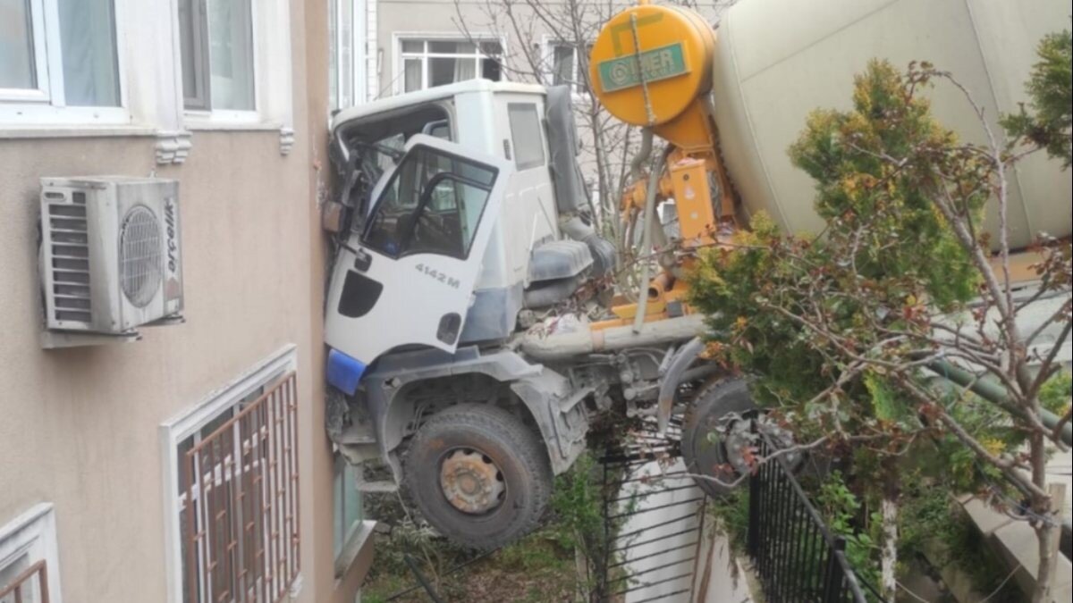 İstanbul'un Beşiktaş ilçesi Dikilitaş Mahallesi Yeni Gelin Zerde Sokak'ta sürücüsünün direksiyon hakimiyetini kaybettiği beton mikseri, 7 katlı binanın 2. ve 3. katındaki dairelerin duvarına çarptı.