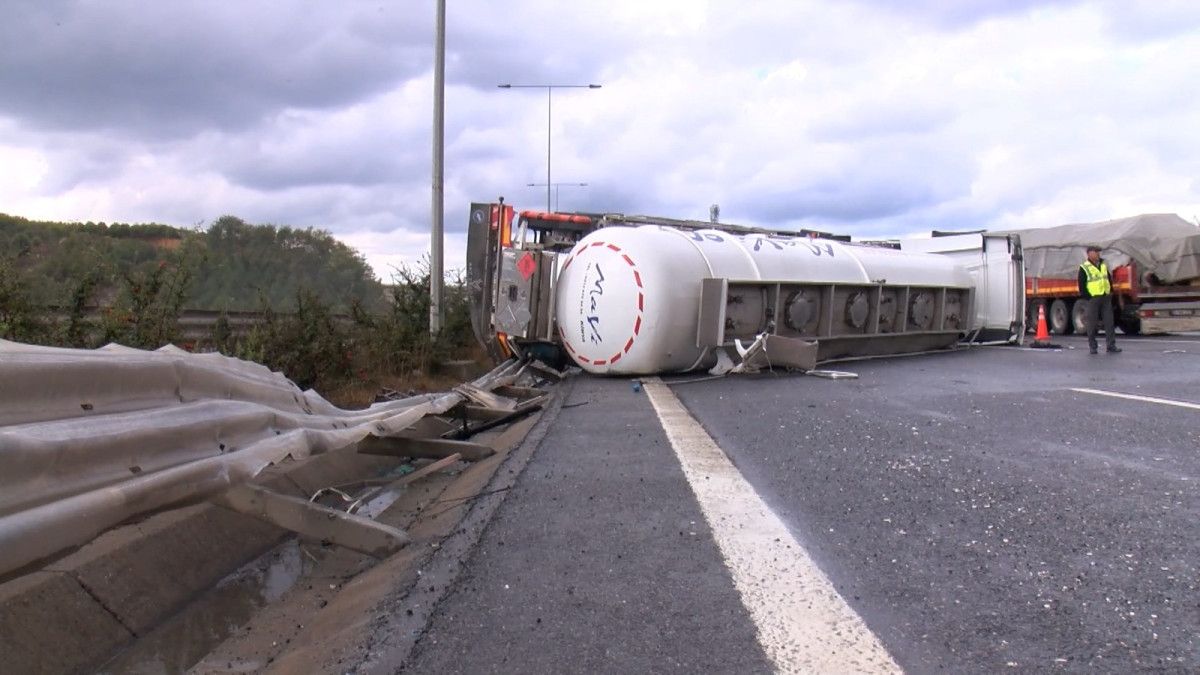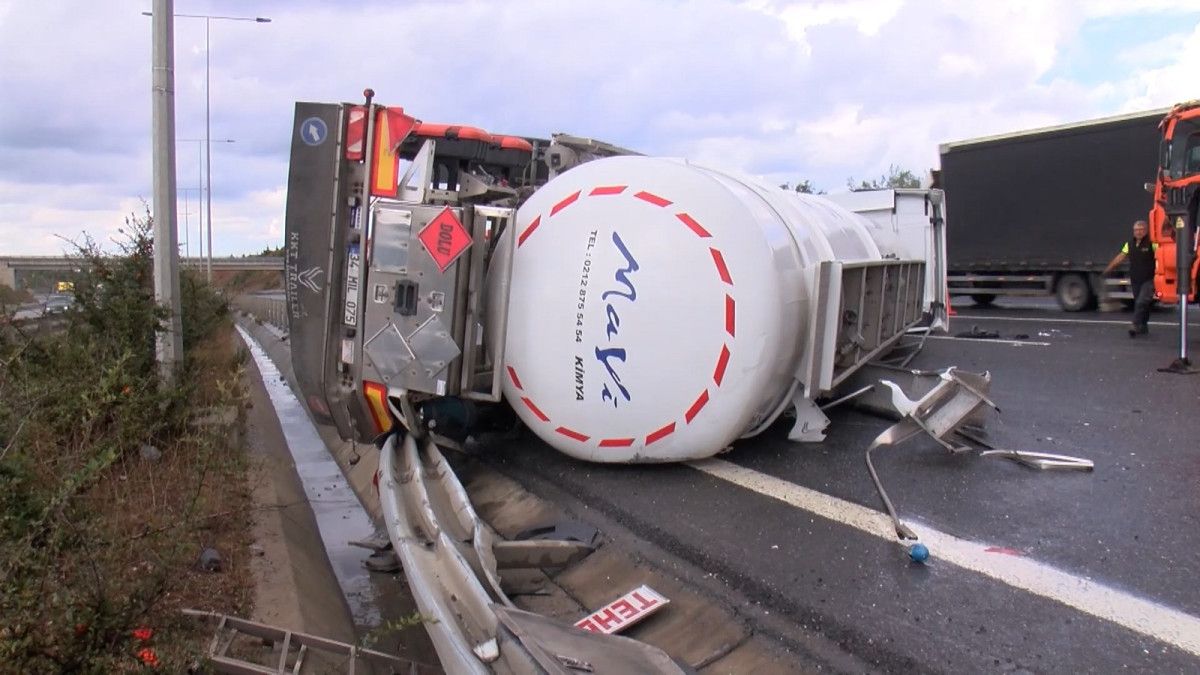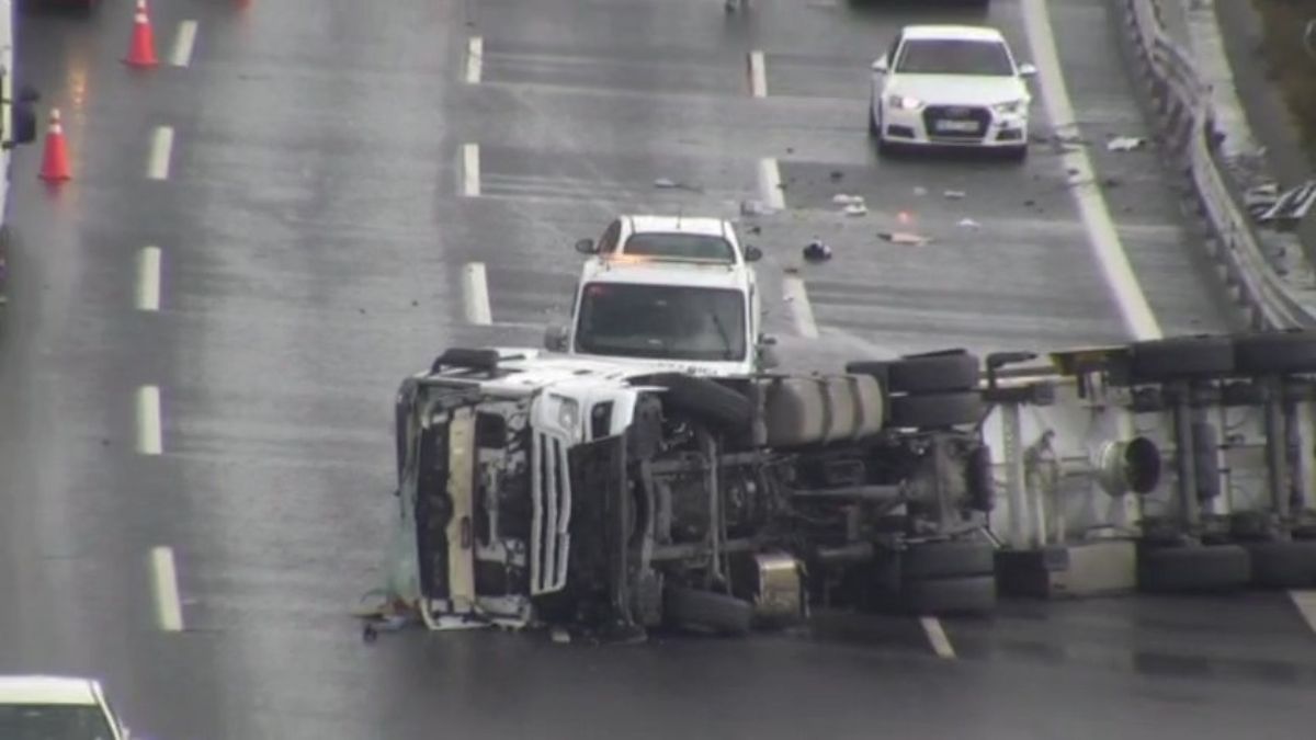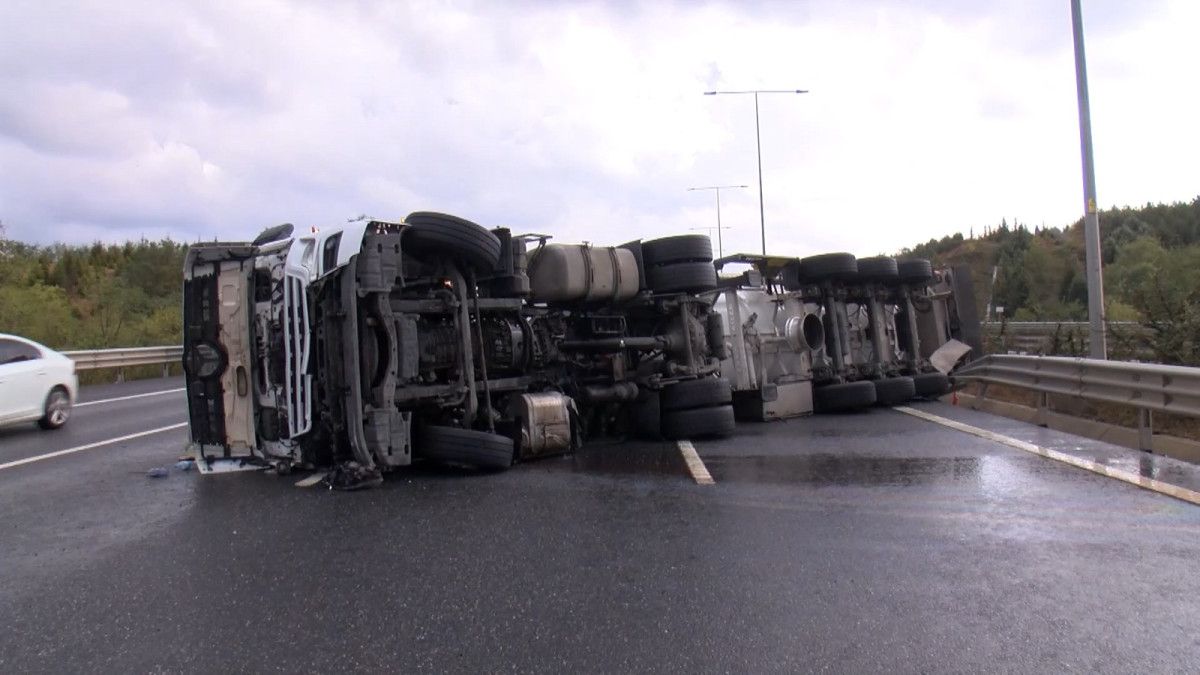 - Beykoz Kuzey Marmara Otoyolu'nda, kimyasal madde yüklü tır, yağış nedeniyle kayganlaşan yolda kontrolden çıkarak bariyerlere çarpıp devrildi.