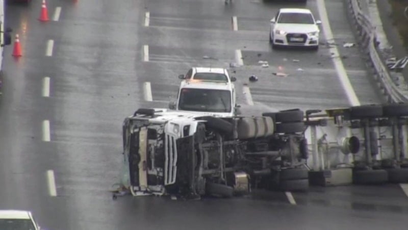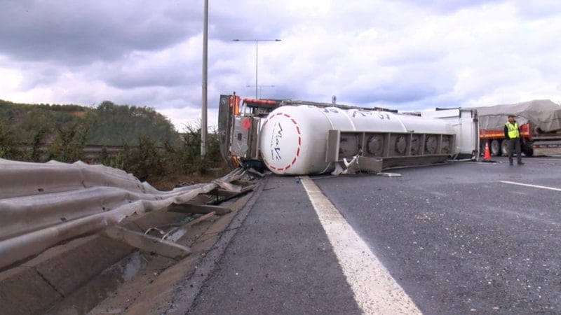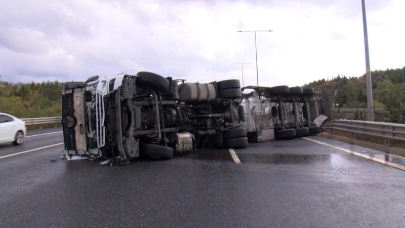 İstanbul Beykoz’da Kuzey Marmara Otoyolu Riva mevkiinde, yağış nedeniyle kayganlaşan yolda kontrolden çıkan kimyasal madde yüklü tır bariyerlere çarpıp devrildi.