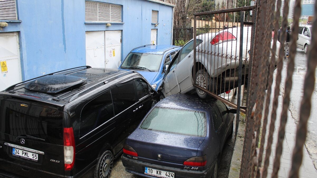 Çarpmanın etkisiyle sürücünün direksiyon hakimiyetini kaybettiği araç, yol kenarında bulunan fabrika otoparkının demir parmaklıklarını aşıp, 4 aracın üstüne uçtu.
